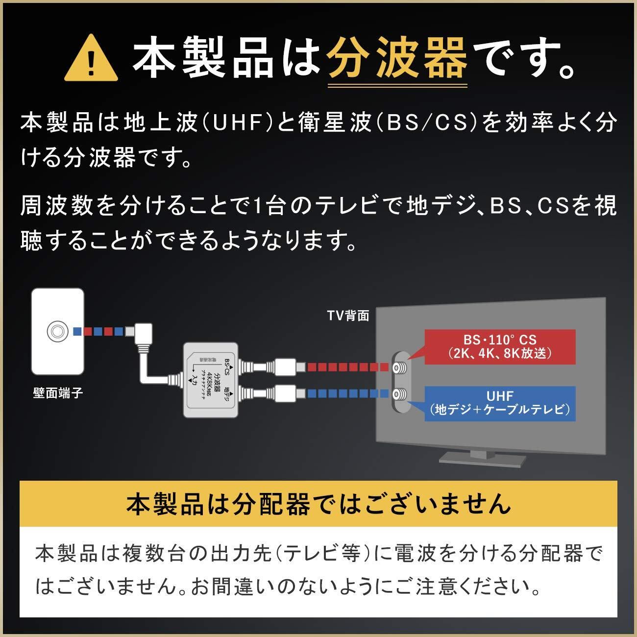 【これ1本で地デジとBS/CSの電波を効率的に分ける】入出力ケーブル一体型分波器です。本製品だけで地デジとBS/CSの電波を分けることが可能。入力ケーブルを別途購入する必要はありません。2K、4K、8K対応のハイスペック仕様で、臨場感あふれる高画質な映像を楽しめます。