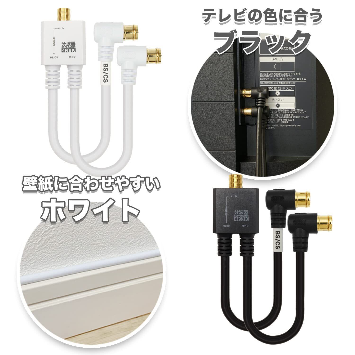 ■地デジ放送、BS/CS放送をそれぞれ視聴したいときはコレ! 地上波(UHF)と衛星波(BS/110度CS)を効率よく分け、1台のテレビで地デジ、BS、110度CS放送を視聴できます。 ■新4K8K衛星放送対応 従来の地デジ、BS、110度CS放送に加えて、最新の4K/8K放送にも対応しています。 ■ケーブル一体型構造 分波器本体と出力側ケーブルが一体型のつくりになっているため、分離型に比べて接続損失を軽減することが可能です。 ■便利なL字差込式コネクタ 狭い隙間での接続にはもちろん、テレビのアンテナ端子位置によっては、配線の露出を防ぐことができ非常に便利です。 ■BSアンテナ電源供給可能 【使用上の注意】 ご使用には入力用のアンテナケーブル(別売)が必要です。