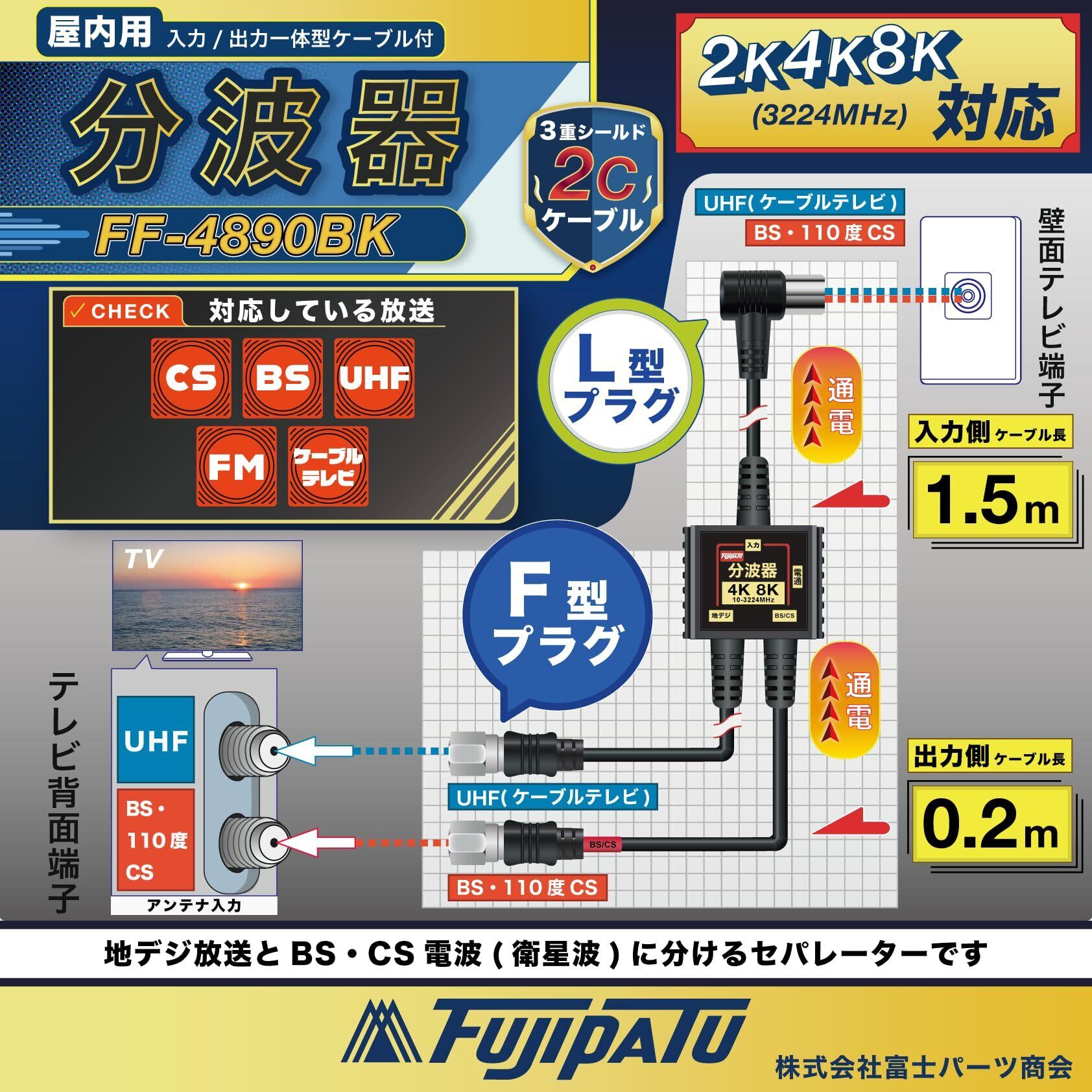 F-Factory 分波器 アンテナ分波器 入力/出力一体型ケーブル付き 4K8K放送 BS CS 地デジ CATV 対応 S-2C-FBケーブル 1.5m+20cm ノイズに強い 金属ケース+3重シールド構造 ブラック FF-4890BK