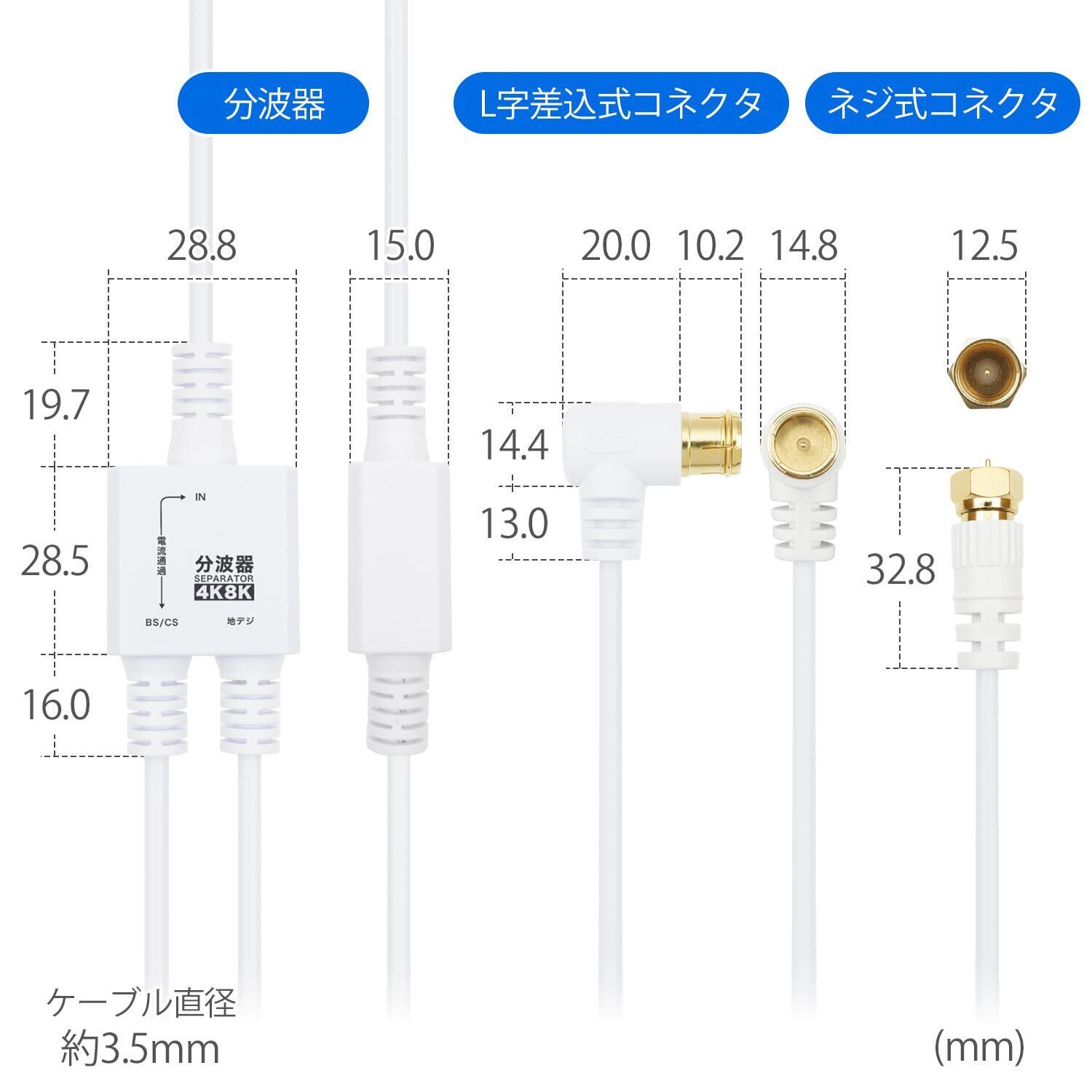 ホーリック アンテナ分波器 【4K8K放送(3224MHz)/BS/CS/地デジ/CATV 対応】 極細ケーブル一体型 1.5m/30cm ホワイト ネジ式コネクタ AE-790WW