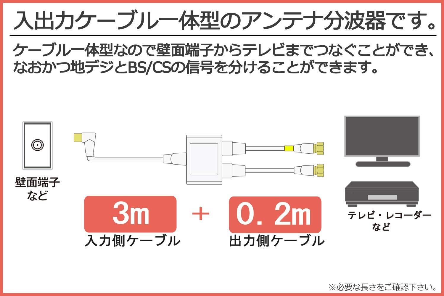 分波器ケーブル長:20cm、出力端子:F型接栓プラグ、入力ケーブル長:3m、F型プラグ(L型)、カラー:ホワイト、プラグ部分:金メッキ
