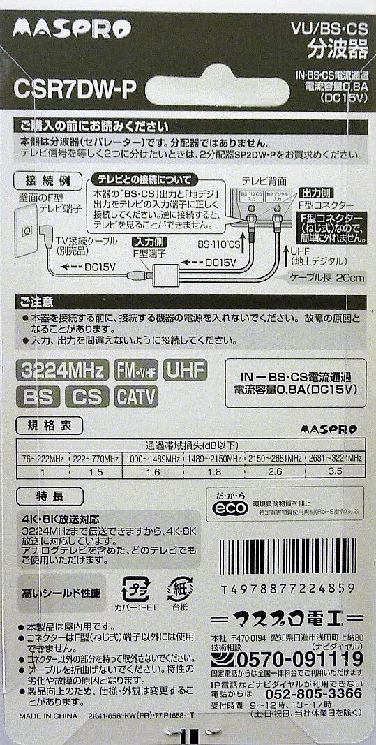 マスプロ 4K・8K放送(3224MHz)対応 VU/BS・CS分波器 (セパレーター) CSR7DW-P