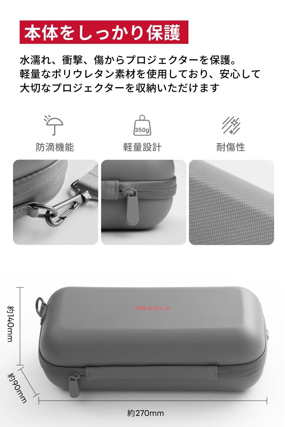 本体をしっかり保護:水濡れ、衝撃、傷からプロジェクターを保護。軽量なポリウレタン素材を使用しており、安心して大切なプロジェクターを収納いただけます。