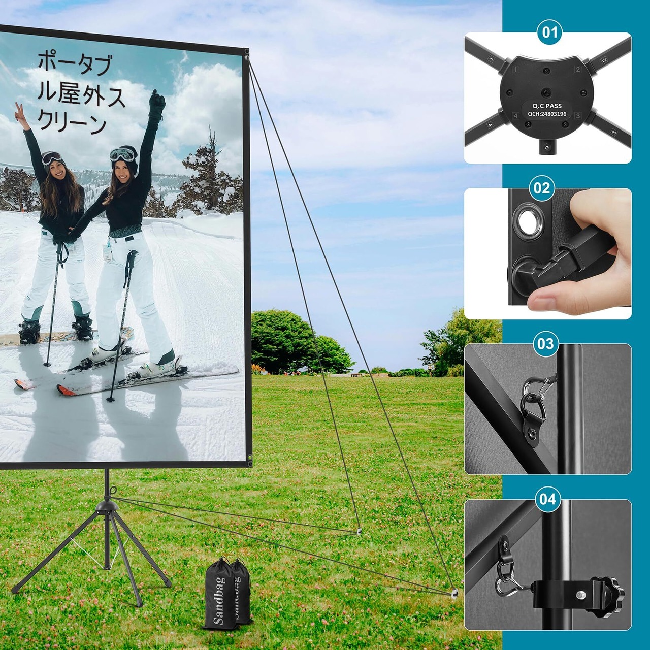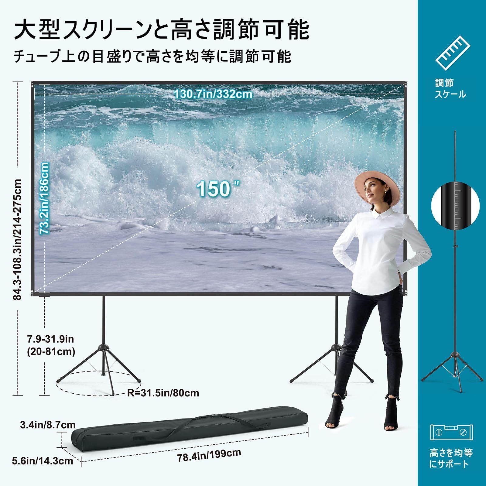 スタンド付き屋外 プロジェクター スクリーン 150インチ 16:9 携帯型 プロジェクター用 スクリーン 高輝度1.5倍ゲイン ファイバーグラス製 頑丈なバッキング構造 耐風設計 三脚/壁面両用取り付け可能 ホームシアター・バックヤードパーティーに最適。