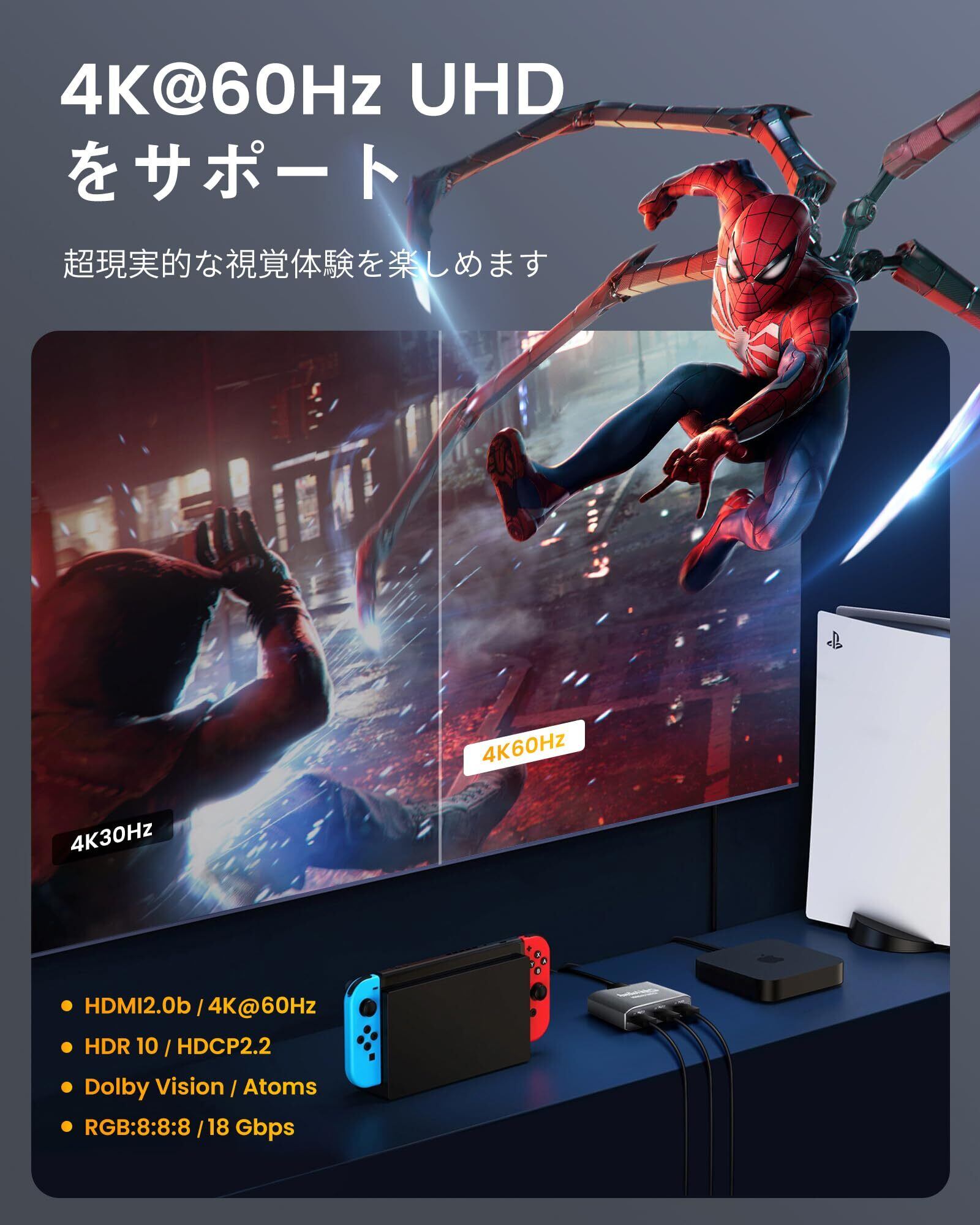 4K@60Hz HDMI2.0b 切替器 - hdmi 切り替え 4K@60Hz HDCP2.2 , HDMI2.0b , 4Kx2K 3D映像 HDRカラーフォーマットRGB 8 : 8 : 8、12ビットへの深い色4k@30Hz高速18 Gbps / 250 MHZリフレッシュレート4 k@60 Hz超高精細ディスプレイより明確かつ繊細な、ホームシアター体験を完了します。