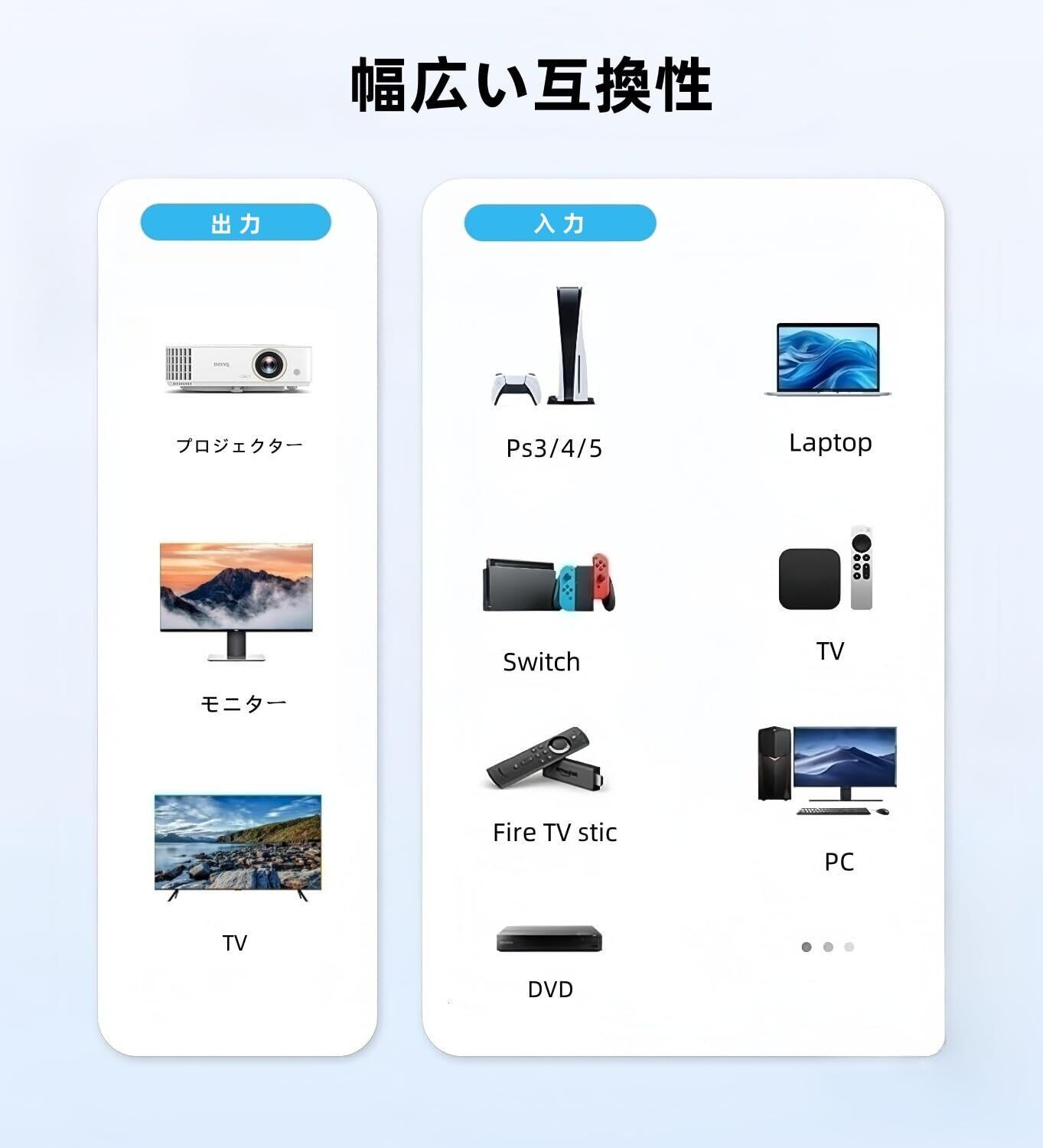 【対応機種】HDMI 切り替え器の入力はPS5、PS4/pro、PS3、NintedSwitch、Box、Fire TV、ラップトップ、TV BOX、Blu-Ray DVDプレーヤーなどに対応。出力はテレビ、パソコン用ディスプレイ、プロジェクターなどに対応。(box 0ne、PS4 proなどに使う時には、標準のHDMI 2.1ケーブルを使うのはおすすめ。)