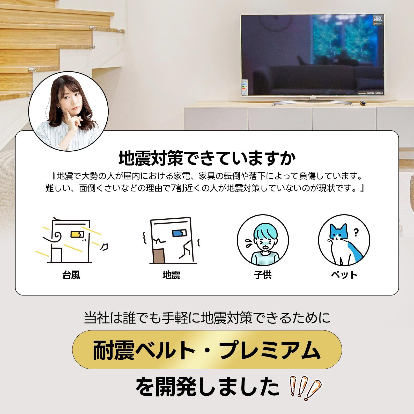 【耐震ベルト・プレミアム】震度7相当の振動試験をクリアし、耐震力はトップクラス。テレビ/液晶モニター裏面のVESA穴を利用して、転倒を防止します。地震などの転倒を防ぎ、ケガを予防する安全対策アイテムです。
