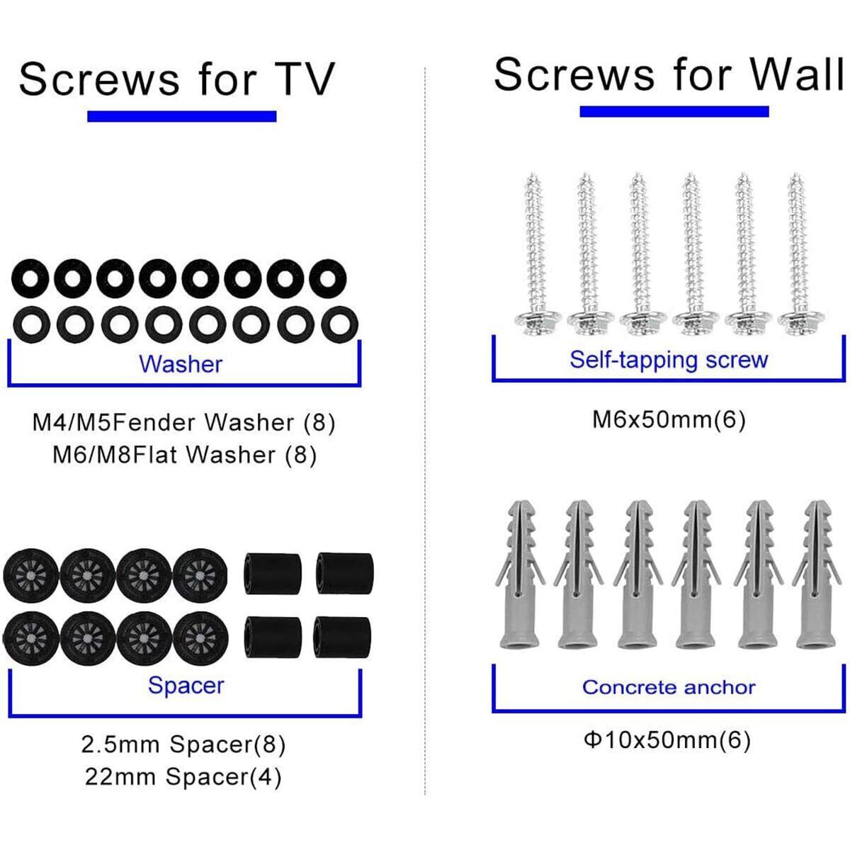 【対応機種】全100個のパーツで構成され、M4、M5、M6、M8サイズのネジ、ワッシャー、スペーサーが含まれています。80インチまでのテレビに対応し、あらゆるテレビブランドの壁掛けやモニタースタンドに使用できます。