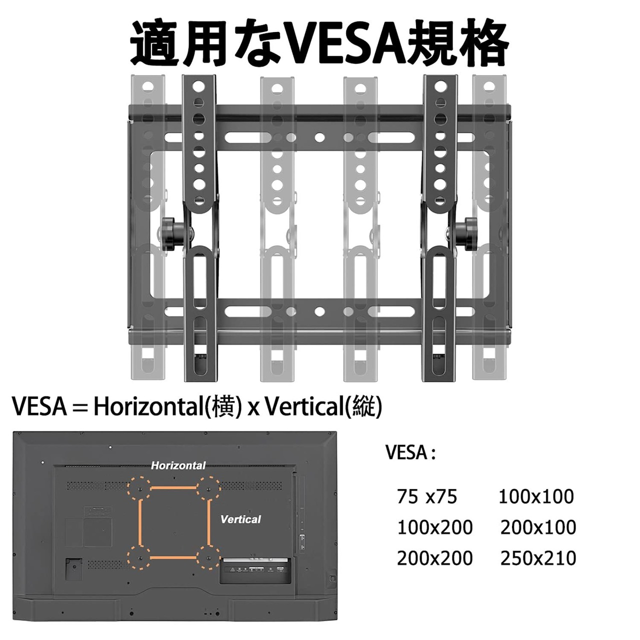 【幅広く対応-液晶テレビ 壁掛け金具】VESA規格(テレビ背面のネジ穴の間隔):幅75~250mm 、高さ75~210mm。 テレビ用ブラケットはVESA75X75mm、100X75mm、100X100mm、100X200mm、200X75mm、200X100mm、200X200mm、250X210mmに対応しています。