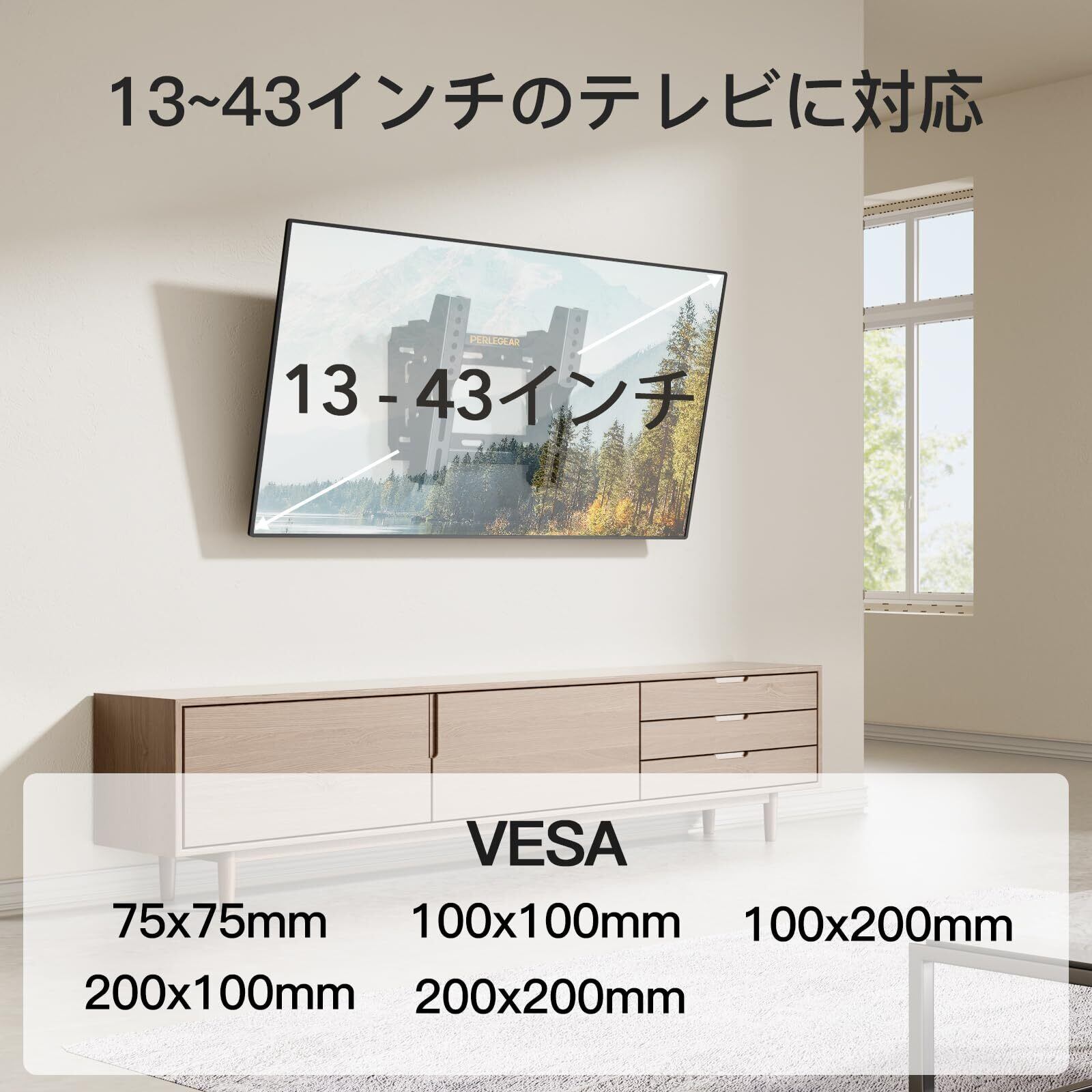 【13~43インチのテレビに対応】PERLEGEARのテレビ壁掛け金具は、VESA規格75 x 75 ~200 x 200mmの25kgまでのほとんどの13インチ~43インチのテレビに対応します。