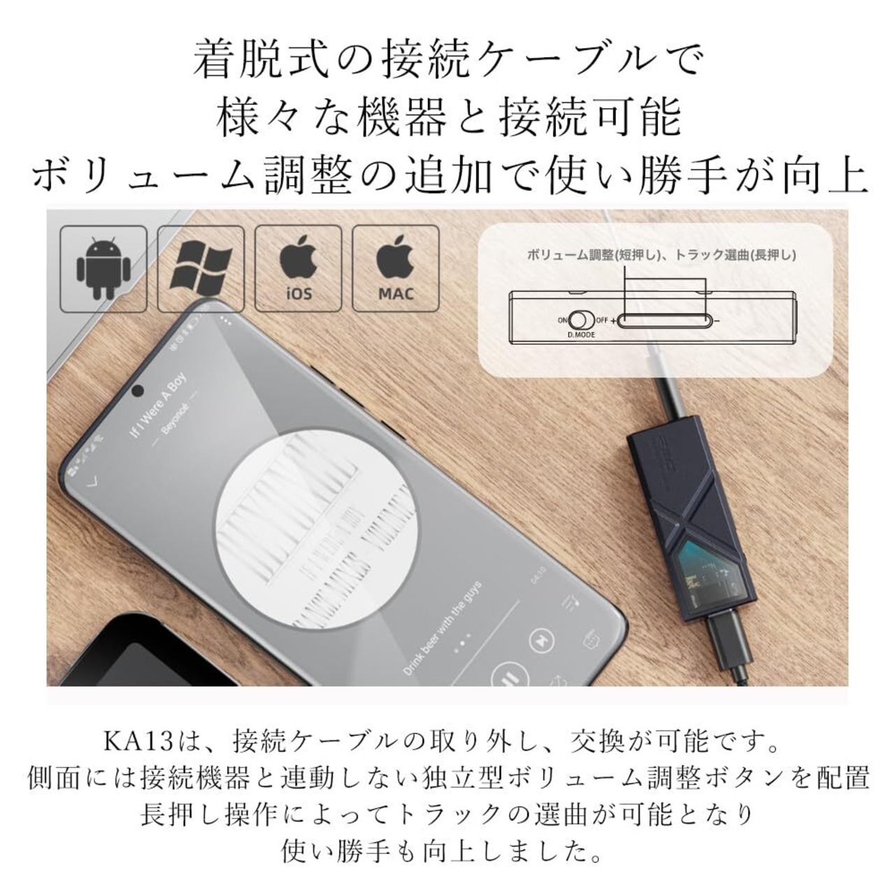 スマホ・タブレットでいつでもどこでもハイレゾ再生:KA13は、スマホ本体やBluetooth製品では真価を発揮することが難しいハイレゾデータ/ハイレゾストリーミング再生を、シンプルかつ高品位に提供するソリューションとして開発されました。 電源のいらないバスパワー駆動ながら、PCM384kHz/32bit,DSD256までレゾリューションに対応し、3.5mmのステレオヘッドホン出力だけでなく4.4mmバランスヘッドホン出力を装備しています。デスクトップモードを搭載し、最大550mWの出力が可能です。 KA13と手持ちのスマホとイヤホン/ヘッドホンさえあれば、至高の音楽体験を手中にすることが可能です。