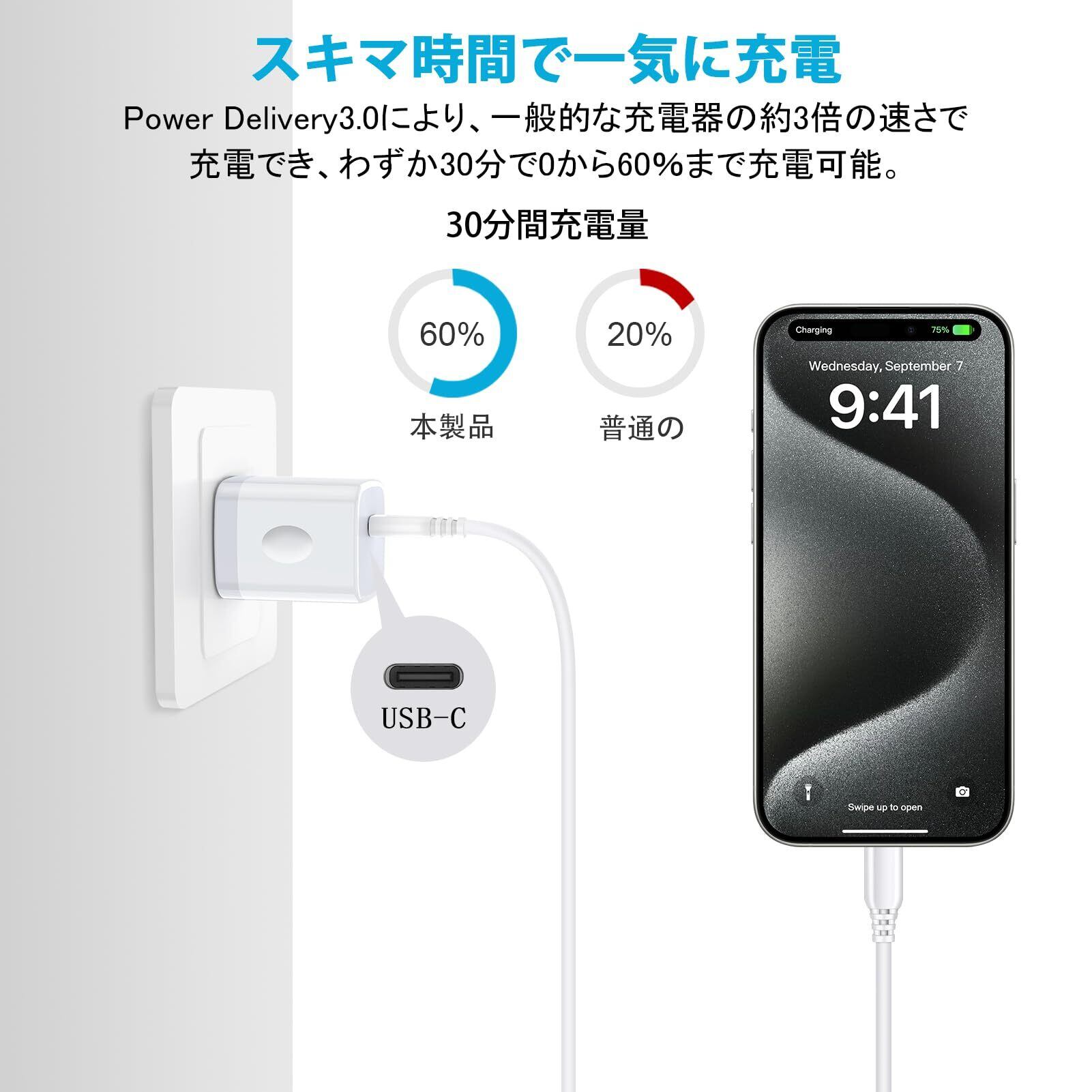 PD3.0 急速充電アダプター: Power Delivery 3.0の充電技術を採用して、Apple最新モデルiPhone8を始め、アップル純正の電源アダプターより3.5倍速く充電を実現できる20W USB C 充電器です。iPhone15 plusへ僅か30分で55%までに充電できます。USB Power Deliveryとの互換性をさらに高めながら、Qualcomm Quick Chargeなどの充電規格にも対応し、より幅広い機器へのフルスピード充電が可能となりました。