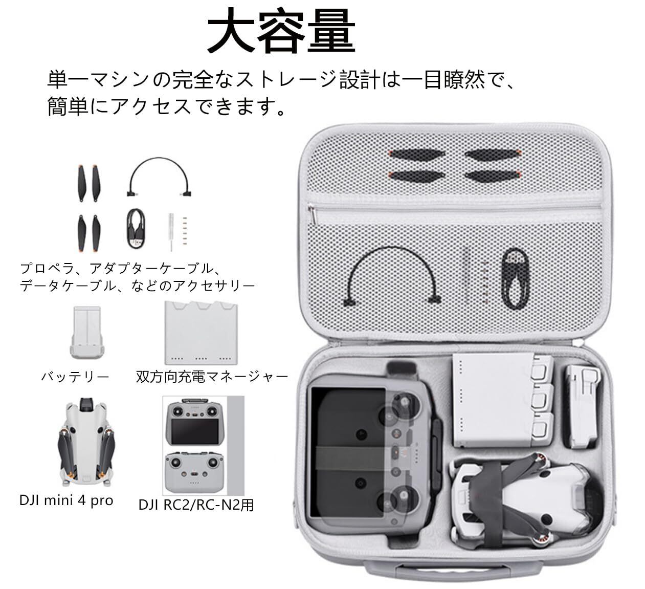 【大容量】DJI MINI4 PRO本体、DJI-RC 2/DJI RC-N2リモコン、バッテリー、双方向充電マネージャー、プロペラ、データケーブル、アダプターケーブルなどのアクセサリーを収納できます。