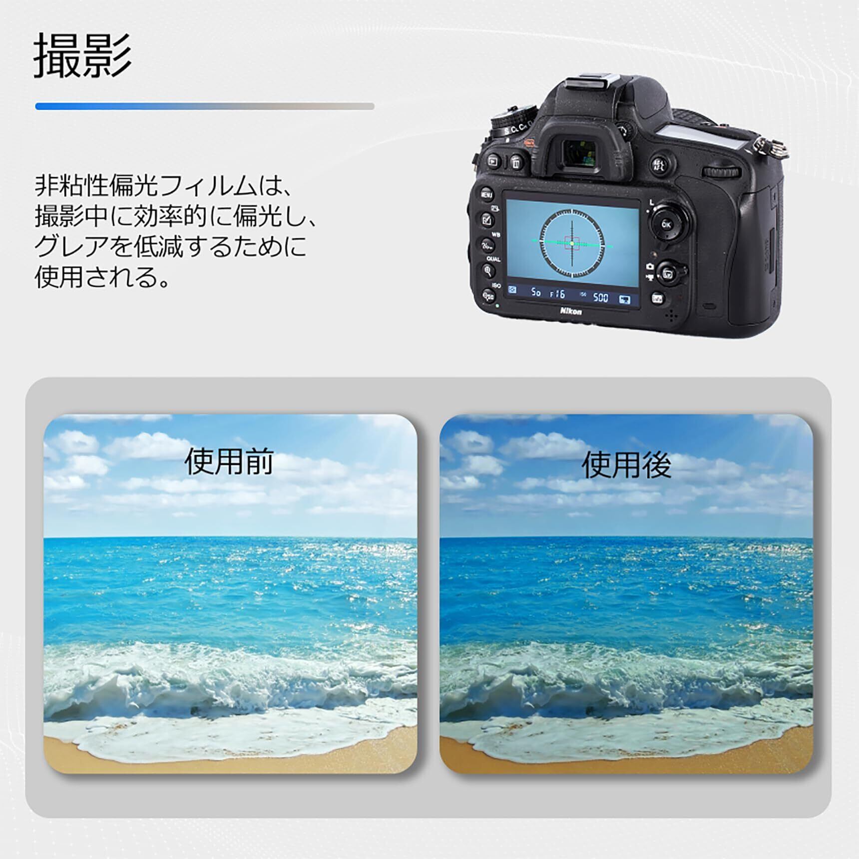 【使用方法】偏光フィルターの埃を取り除いた後、保護フィルムをはがし、角度を調整して使用します。