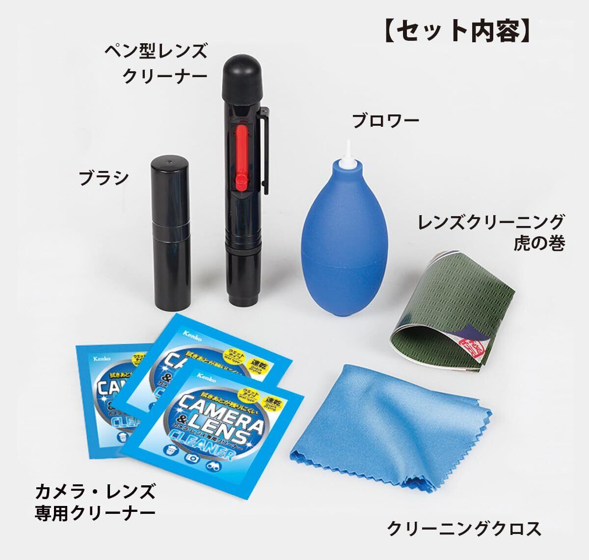 セット内容:ペン型レンズクリーナー、ブラシ、ブロワー、クリーニングクロス、カメラ・レンズ専用クリーナー(3枚)、レンズクリーニング虎の巻