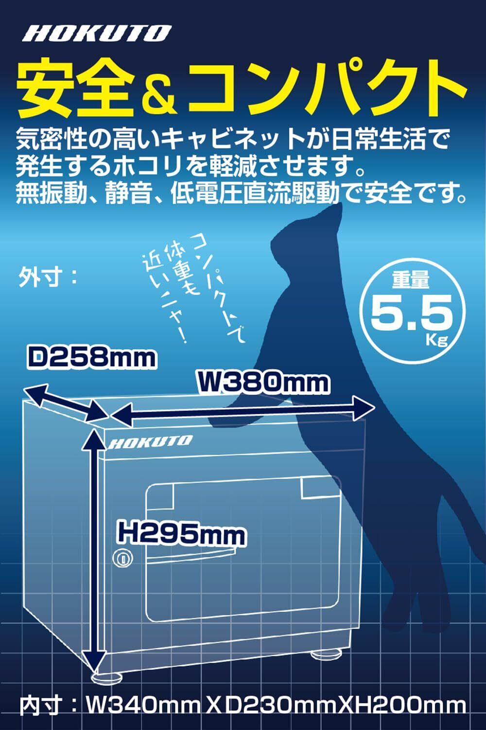 【6. 無音・無振動で寝室にも設置可能】 HOKUTOの防湿庫は、動作音がほぼゼロの静音設計。寝室やリビングに置いても、騒音を気にせず快適に使用できます。 【7. 高気密キャビネットでホコリをシャットアウト】 湿度管理機能に加え、気密性の高い構造でホコリの侵入を防止。カメラやレンズを清潔に保ち、カビや錆の発生を抑えて機材の寿命を延ばします。