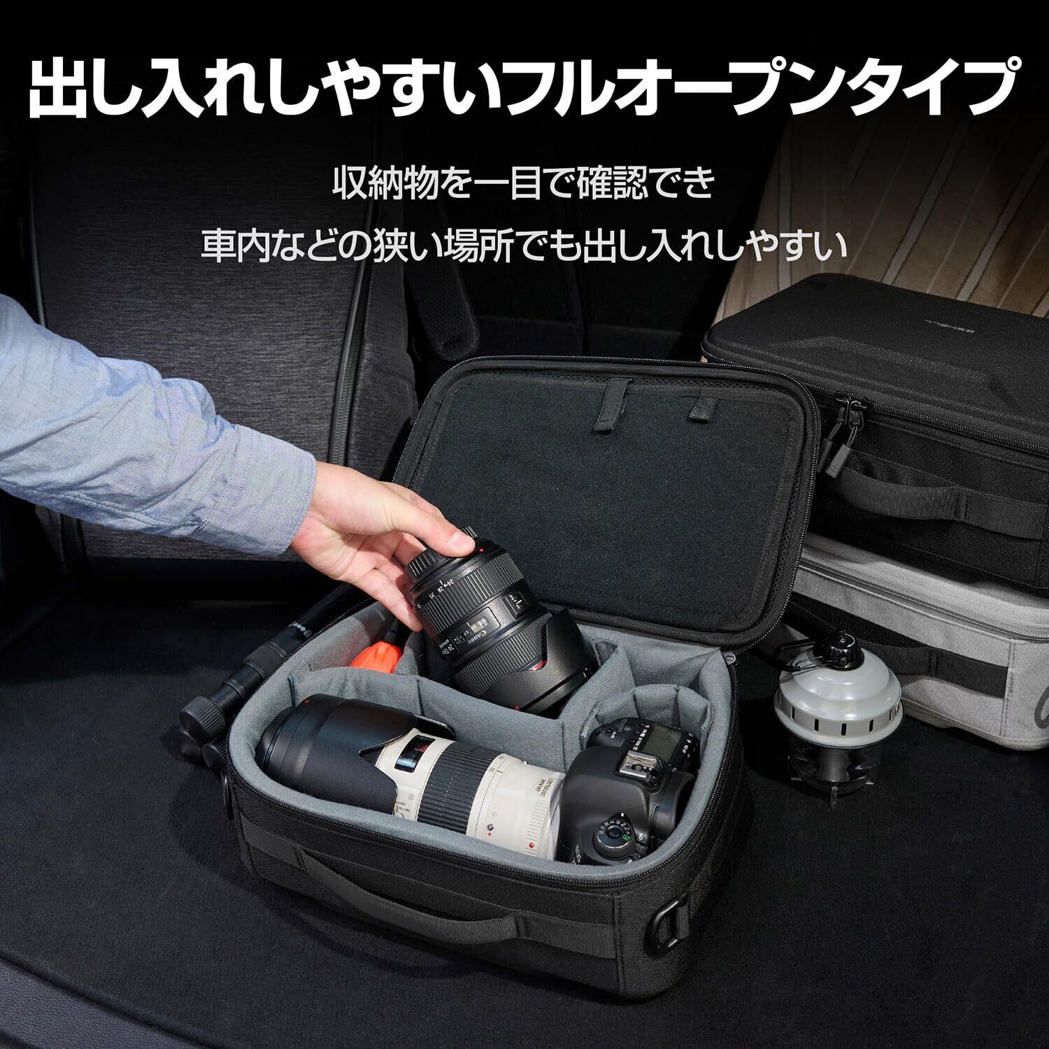 車に積んでカメラやアウトドアグッズなどを運んだり、機内持ち込み可能なキャリーバッグのインナーバッグとして便利に使用できる、セミハードタイプのコンテナケース。