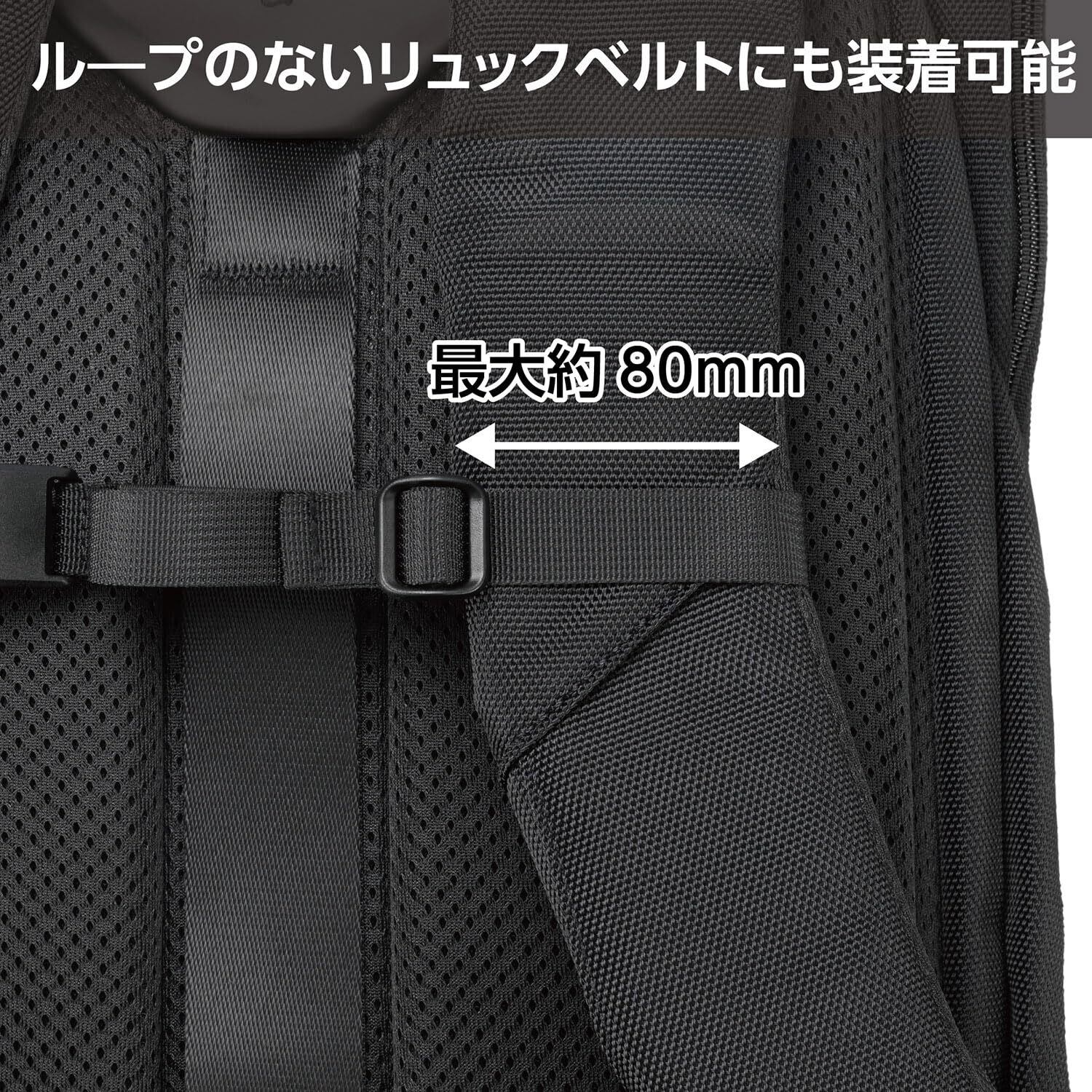 10mm程度の厚さのリュックベルトであれば、幅約80mmまでのリュックベルトに取り付け可能です。ベルトに巻き付けて装着するので、チェストベルト用のループがないリュックベルトにも取り付けが可能です。