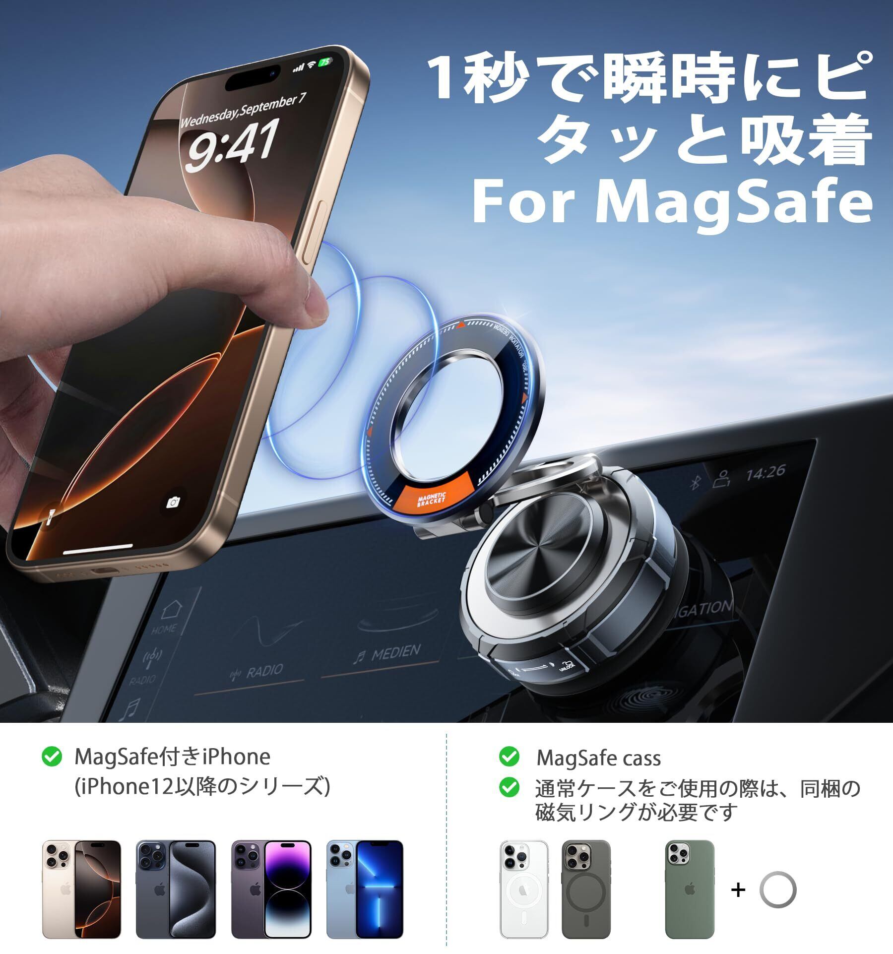 【幅広い対応機種&簡単取付け】For iPhone 16/15/14/13/12シリーズをはじめ、MagSafe対応のすべてのデバイスに対応。MagSafe非対応のスマートフォンでも、付属のマグネットリングを使えば、しっかり固定できます。取り付けはとても簡単で、片手でパッと装着可能。わずか数秒でセッティングが完了します。さまざまな車種にフィットし、どんなスマホでも安定したホールドを実現します。