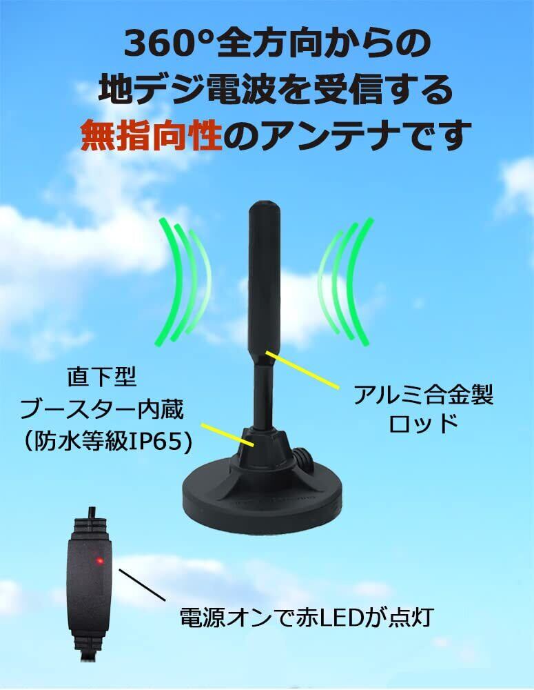 車載用設計のメリット: この種のロッドアンテナは室内用設計のものが多いため、車載用に購入すると以下のような問題に当たることがありますが、本商品は車載用に製作されていますので安心です。 例えば >>> ①雨に濡れて故障する ②アンテナケーブルの長さが足りず、延長ケーブルが必要になる ③車内でブースター電源を取ろうとすると電源ケーブルの長さが足りず延長ケーブルが必要になる(本商品のケーブル分岐点からUSB電源端子までの長さは50cm) ④手持ちのテレビやチューナーのアンテナ端子に合わず、変換アダプターが必要になる >>> 延長ケーブルや変換アダプターは意外に高価で、買い足しは手間とコストが掛かりますのでよくご検討ください。