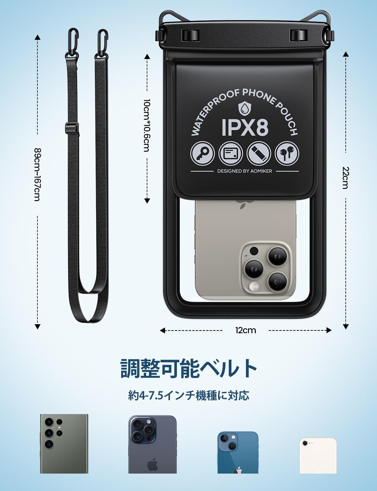 Aomiker スマホ 防水 ケース 小物入れ 収納ポケット付き : 海 プール 水中 撮影 IPX8 スマフォ ぼうすい バッグ 首かけ 水泳 カバー ダブルパック 潜水 ポーチ すまほ 携帯 けいたい アイホン 顔認証 通話 海水浴 iPhone 16e 16 15 14 plus pro promax 13 mini 12 11 プロ マックス se Xperia android に対応 黒