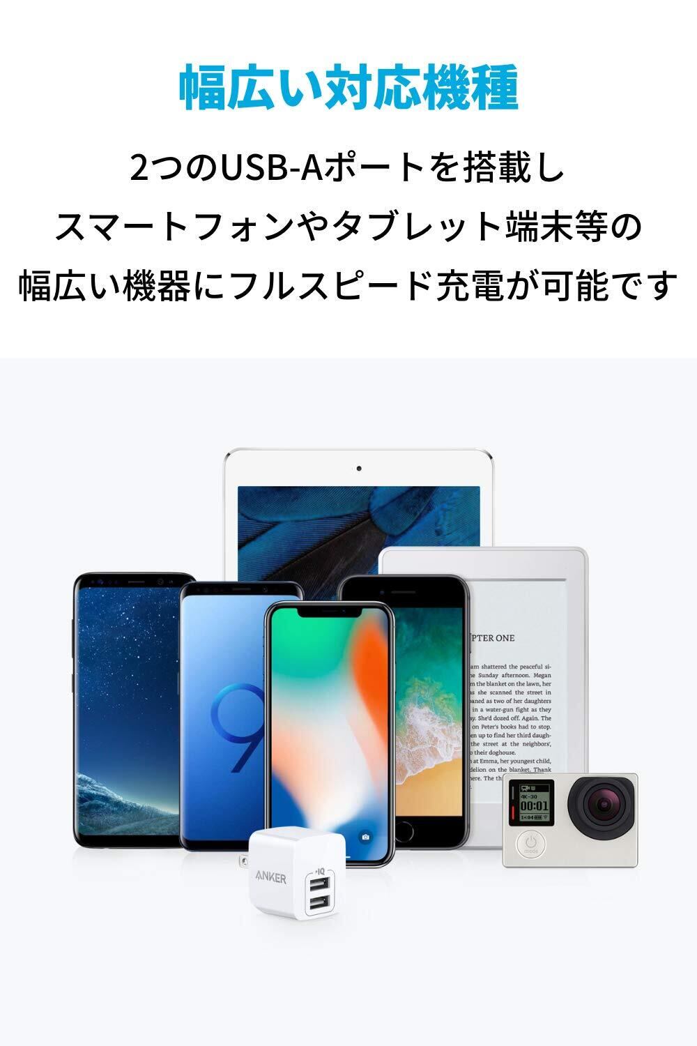 フルスピード充電技術:Anker独自のPowerIQにより、フルスピード充電が可能です(タブレット端末等、2A以上の入力に対応する機器を2台同時に充電する場合、充電速度が遅くなる場合があるため、「Anker PowerPort 2 Elite」をご利用ください)。