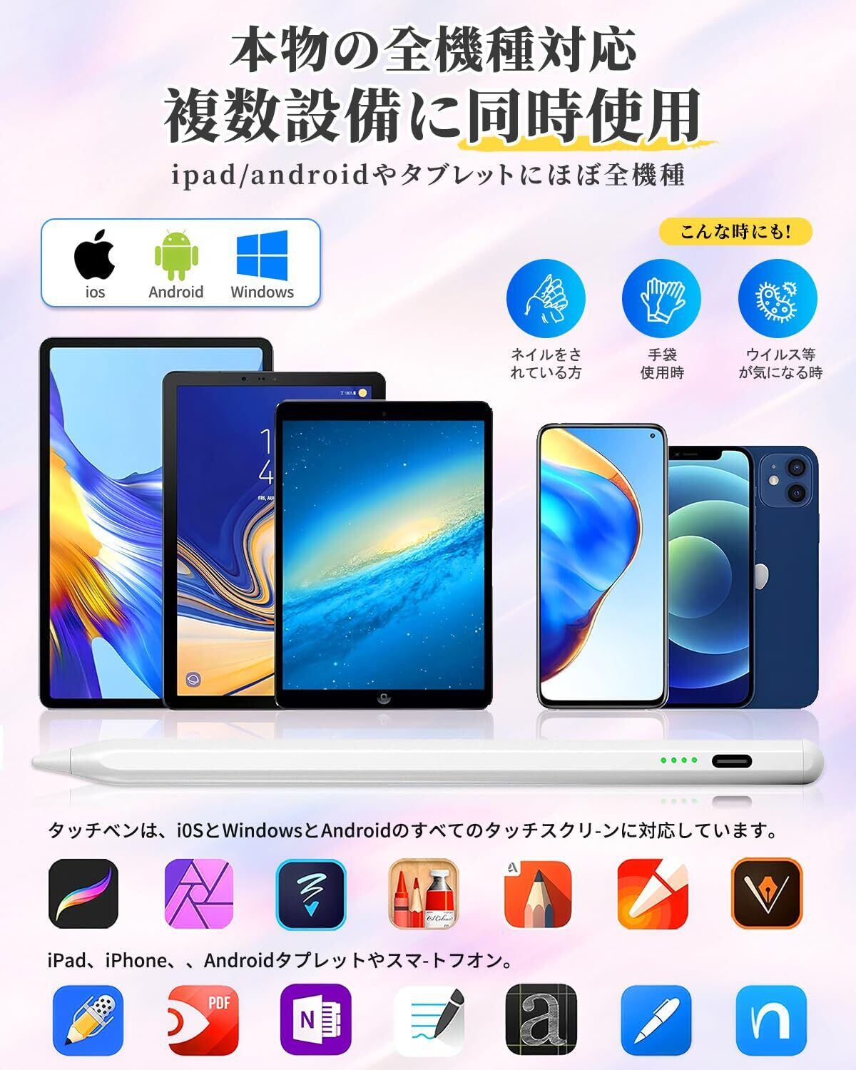 【全機種対応&優れた互換性】スマホ タッチペン全機種対応iPad /iPhone /Android /Kindle /Samsungなどスマホ/タブレットペン/iPad/iPhone/Android/Fire用ペンシルに対応します。ペンシルのペン先はあっぷるぺんしると同じ素材で、スラスラとした書き心地で、画面につっかかることなくスムーズに操作できます。2025新版タッチペン、静電容量式のパネルに対応したipad ペンで、最新のアイパッドはもちろん、iPadでも問題なく快適に使用できます。