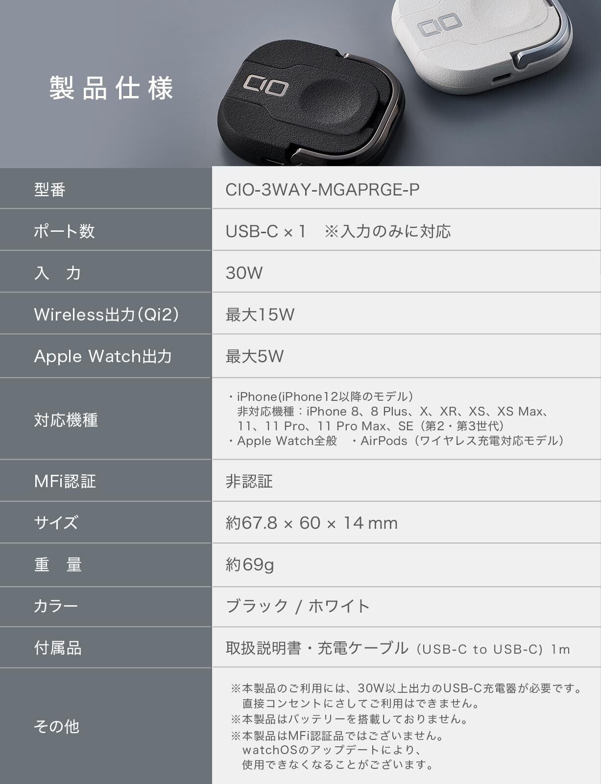 CIO NovaWave 3Way+ [3in1 Qi2 & Apple Watch 充電器] MagSafe対応 ワイヤレス充電器 スタンド iPhone 16 / 15 / 14 / 13 / 12 / AppleWatch Ultra AirPods 充電器 (ブラック)