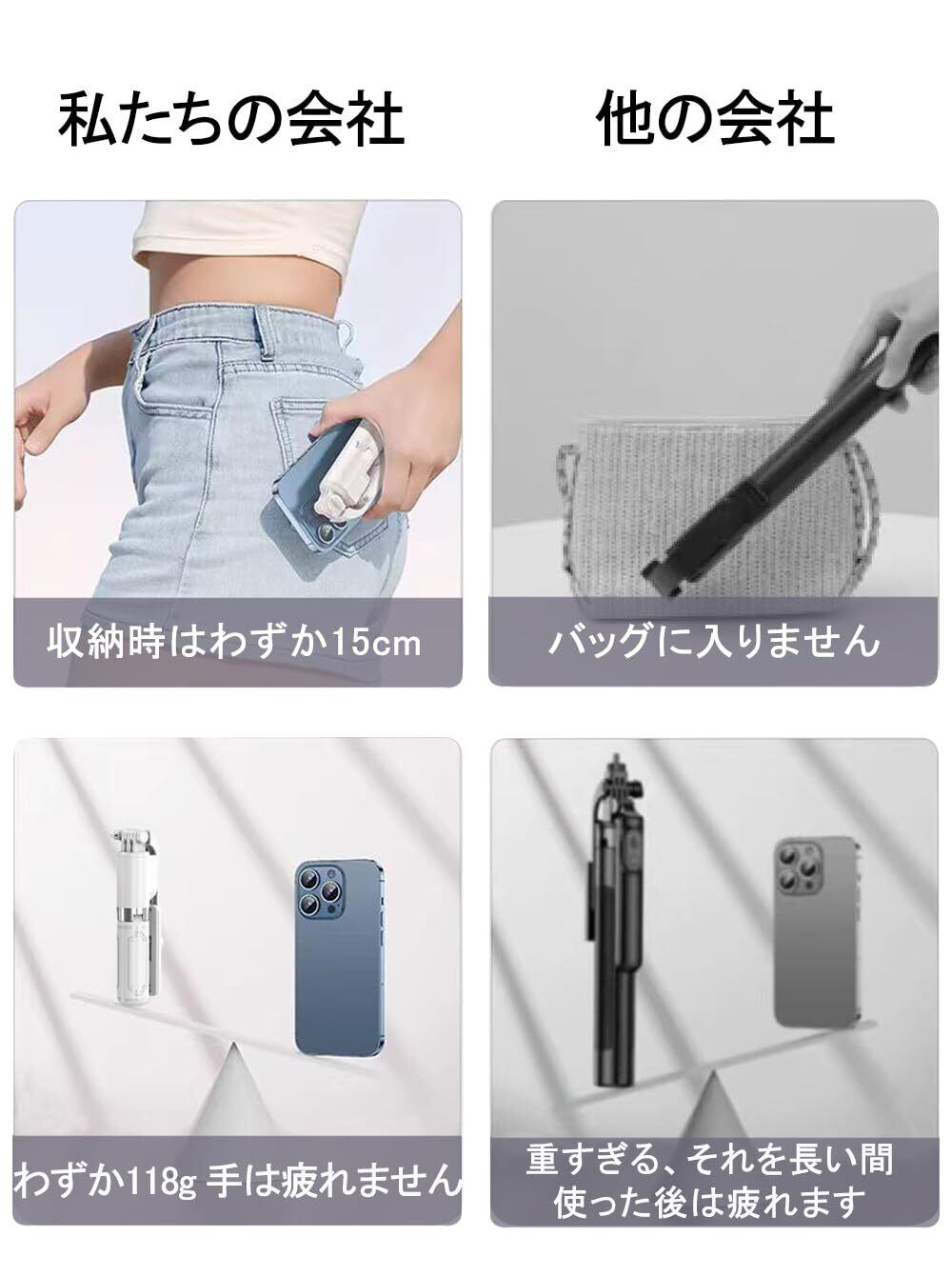 【軽量、ポケットサイズ】自撮り棒を使用するシーンを考えて、数え切れないほどの実験の経て、自撮り棒の機能が満たされている状態で更に小型に進化しました。自撮り棒は67cmまで伸縮可能、折り畳んだ状態は15㎝、ズボンのケットにも入ります。自撮り棒の重量は約118g、市販商品と比べると40%軽量化して、持ち運びは非常に便利です!