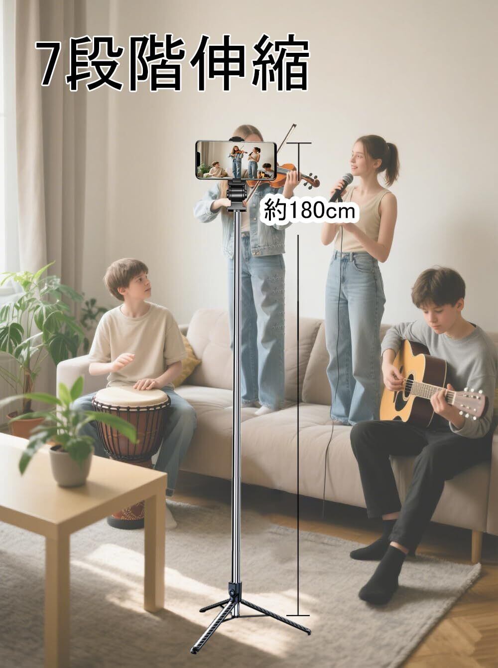 【自撮り棒&三脚でさらに多機能 】 本製品は、7段階の伸縮構造を採用しており、最大で168cmまで伸ばすことができます。さらに、スマホホルダーとスマートフォンを装着した状態では、撮影時の高さは最大約180cmに達し、目線より高いアングルからの撮影も可能です。集合写真やイベント、屋外での風景撮影などでも、しっかりと全体を写せます。収納時はたったの31cmというコンパクトサイズで、リュックやバッグに無理なく収まります。三脚の脚を広げたときの間隔は約37cmで、地面との接地面積が広く、抜群の安定感を発揮します。風のある屋外でもしっかり自立し、ブレのない撮影を実現します。スマホホルダーは、左右360°、上下270°の回転に対応しており、あらゆる角度から自由自在に調整が可能です。風景を大きく撮りたい時や、自分のベストアングルを探したい時にも最適。