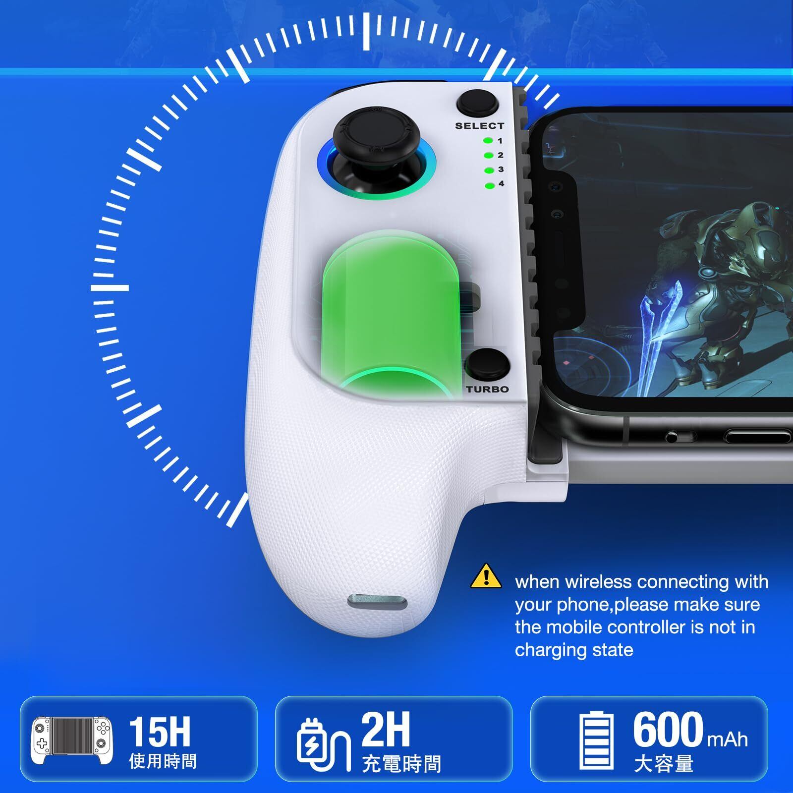 スマホ コントローラー ワイヤレス接続 IOS/Android両用 モバイルゲームコントローラー 伸縮型 PS Remote Play/Xbox Cloud/Steam Link/GeForce Nowゲームなど対応 低遅延 600mAhバッテリー RGBライト白