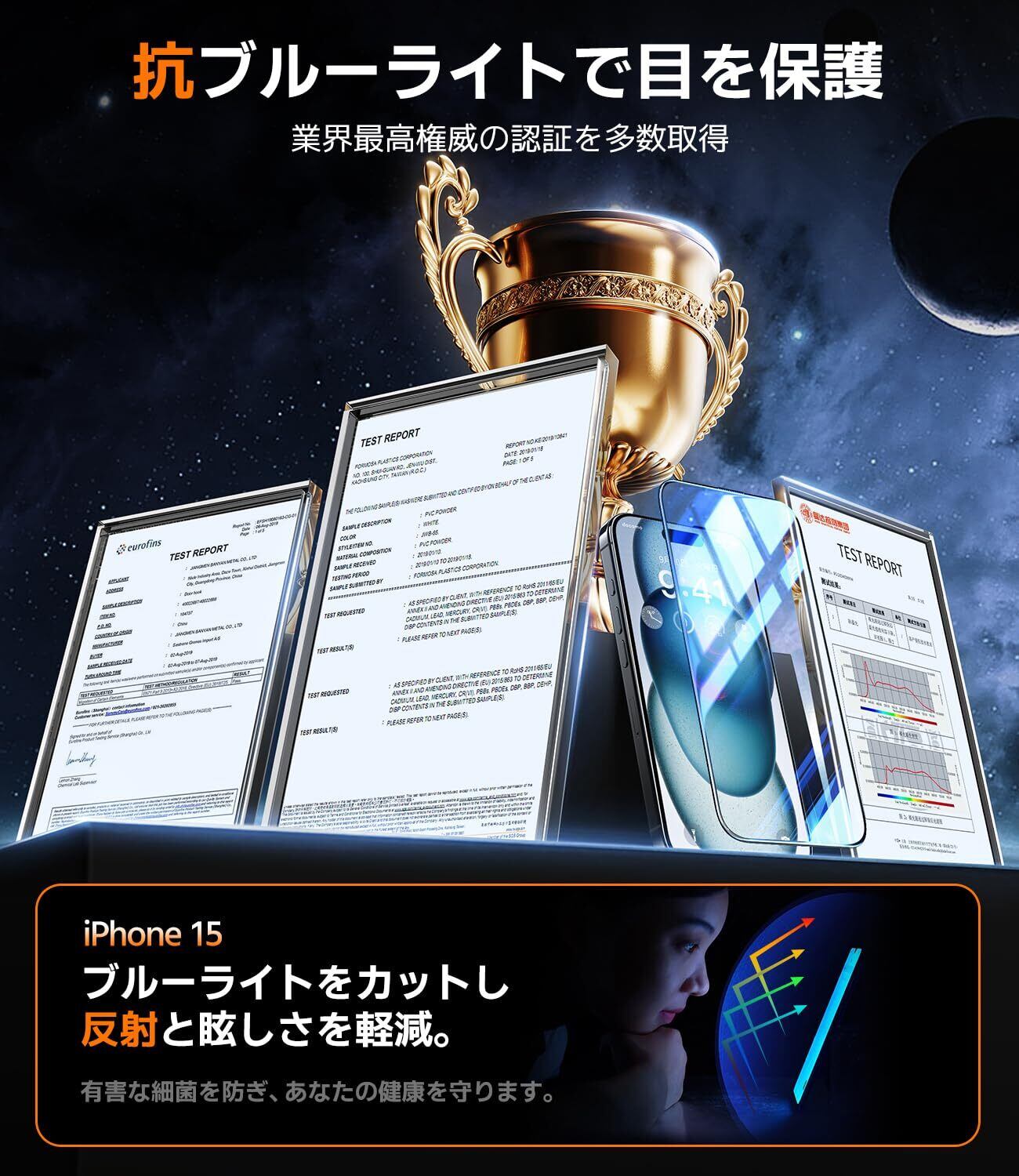 【超クリアなロスレス画質&健康を全面的に守る】このいphone15 保護フィルムは、新しくアップグレードされた高透過率素材を採用し、100%高透光率、スマホ画面のオリジナルの高精細な画質を再現、超クリアな視覚体験を提供します。また、のいphone15ガラスフィルムは、国際認証のブルーライト防止テストと抗菌テストをクリアしています。ガラスフィルム表面のAnti-Reflective/Anti-Blue Lightコーティングにより、ブルーライトを100%カットし、長時間や夜間にスマホを使用する際、ブルーライトが視網膜に与える潜在的なダメージを防ぎます。 目を大切に!さらに、最新のナノ抗菌技術を採用し、表面に付着する99.9%の細菌を強力に抑制します。お子様も安心して触れることができ、あなたとご家族の健康を全面的に守ります。