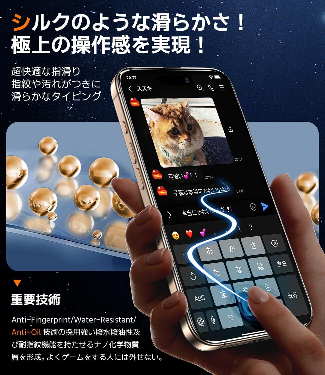 【超クリアなロスレス画質&健康を全面的に守る】このiPhone 16 Pro max フィルムは、新しくアップグレードされた高透過率素材を採用し、100%高透光率、スマホ画面のオリジナルの高精細な画質を再現、超クリアな視覚体験を提供しますまた、のいphone16 Pro maxガラスフィルムは、国際認証のブルーライト防止テストと抗菌テストをクリアしていますガラスフィルム表面のAnti-Reflective/Anti-Blue Lightコーティングにより、ブルーライトを100%カットし、長時間や夜間にスマホを使用する際、ブルーライトが視網膜に与える潜在的なダメージを防ぎます 目を大切にさらに、最新のナノ抗菌技術を採用し、表面に付着する99.9%の細菌を強力に抑制しますお子様も安心して触れることができ、あなたとご家族の健康を全面的に守ります