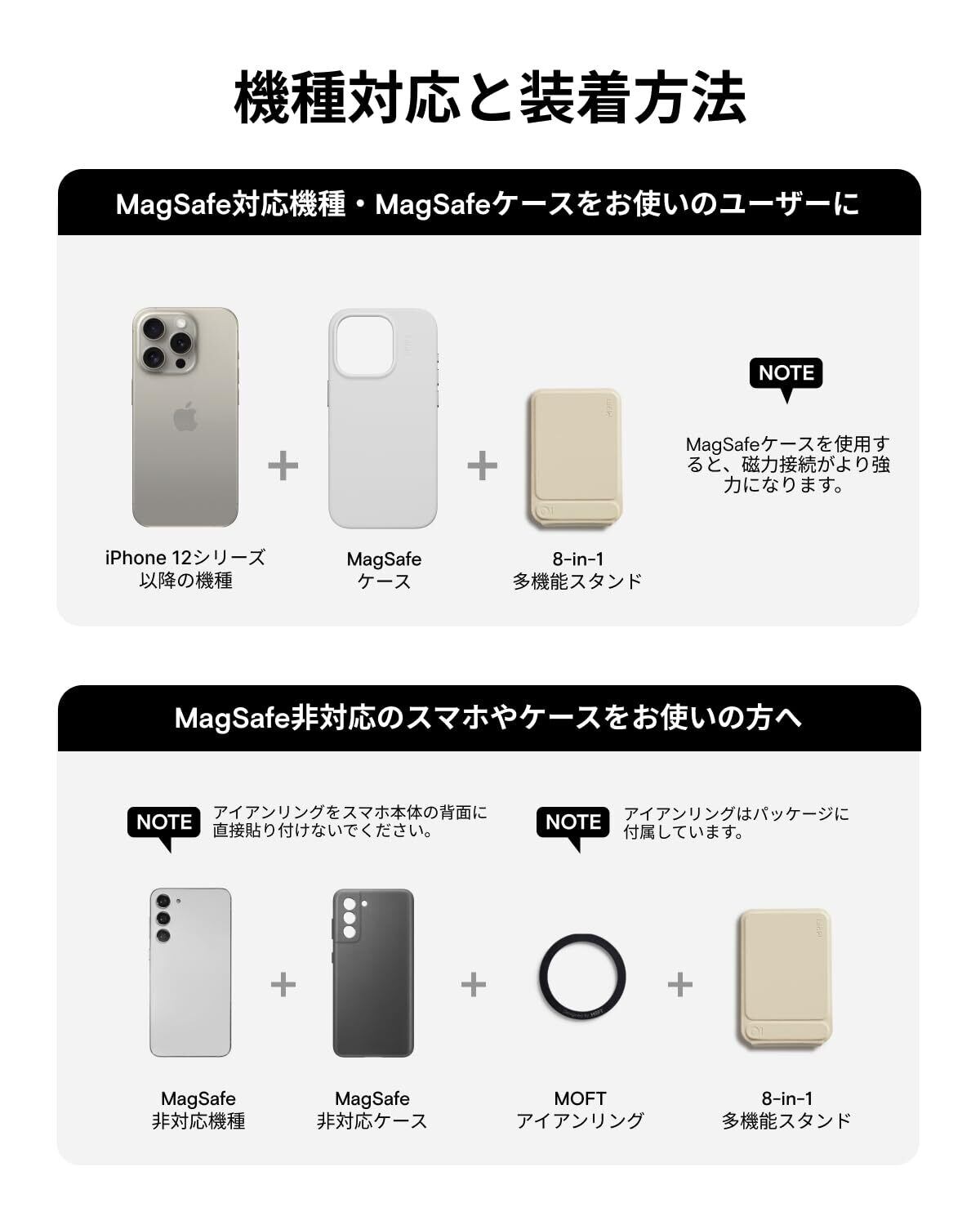 【アイアンリング付き・全機種対応】この携帯スタンドは iPhone 16/15/14/13/12シリーズ(Pro/Pro Max/Plus/Mini含む)に対応。。背面にマグネットが付いていないスマートフォンも、付属のアイアンリングをスマートフォンケースに取り付けるだけで、MOFT 8-in-1多機能スタンドを使用できます。 製品にはマグネットリングが付属しています。取り付け方法については、詳細ページの動画をご参照ください。【注意:粘着面がある側はスマホケースまたはスマホの背面に貼り付けてください。スタンドには貼り付けないでください。】