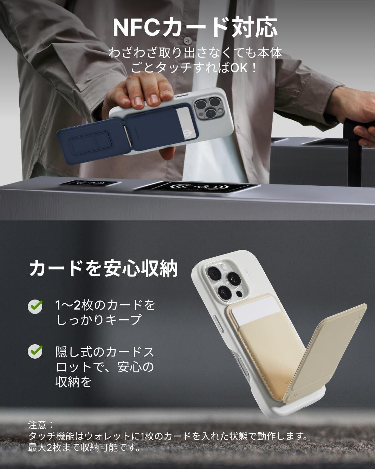 【NFCカード対応!かざすだけでアクセス】マイナンバーカードや運転免許はもちろん、お札や名刺、Suicaなどの交通系ICカードやタッチ決済に対応したクレジットカード、カードキーまで収納可能。カバンから取り出す手間なく、本体ごとタッチするだけでスムーズな決済が可能です。カードケースには1~2枚のカードまで収納できますが、NFC機能を使用するためには、カードを1枚だけ入れてください
