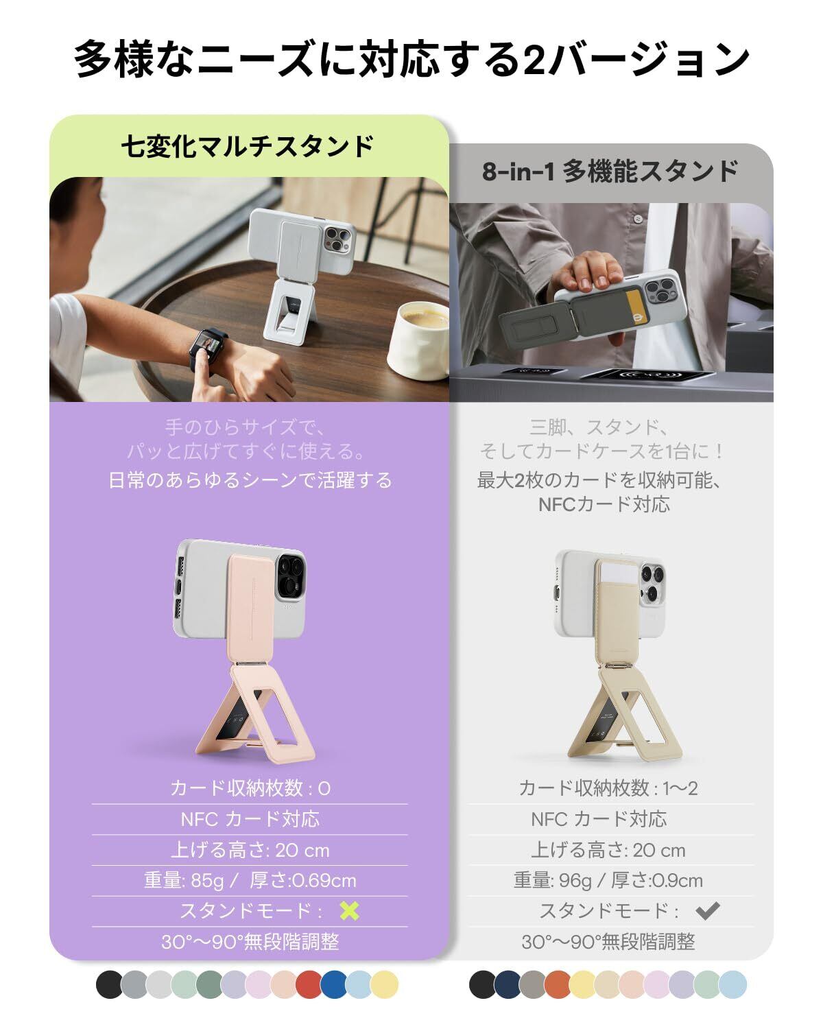 【アイアンリング付き・全機種対応】この携帯スタンドはiPhone 15 Pro Max/ iPhone 15 Pro/ iPhone 15 Plus/ iPhone 15/ iPhone 14 Pro Max/ iPhone 14 Pro/ iPhone 14 Plus/ iPhone 14/ iPhone 13 Pro Max/ iPhone 13 Pro/ iPhone 13/ iPhone 13 Mini/ iPhone 12 Pro Max/ iPhone 12 Pro/ iPhone 12/ iPhone 12 Mini すべてのシリーズに対応しています。背面にマグネットが付いていないスマートフォンも、付属のアイアンリングをスマートフォンケースに取り付けるだけで、MOFT七変化マルチスタンドで使用できます。 製品にはマグネットリングが付属しています。取り付け方法については、詳細ページの動画をご参照ください。【注意:粘着面がある側はスマホケースまたはスマホの背面に貼り付けてください。スタンドには貼り付けないでください。】