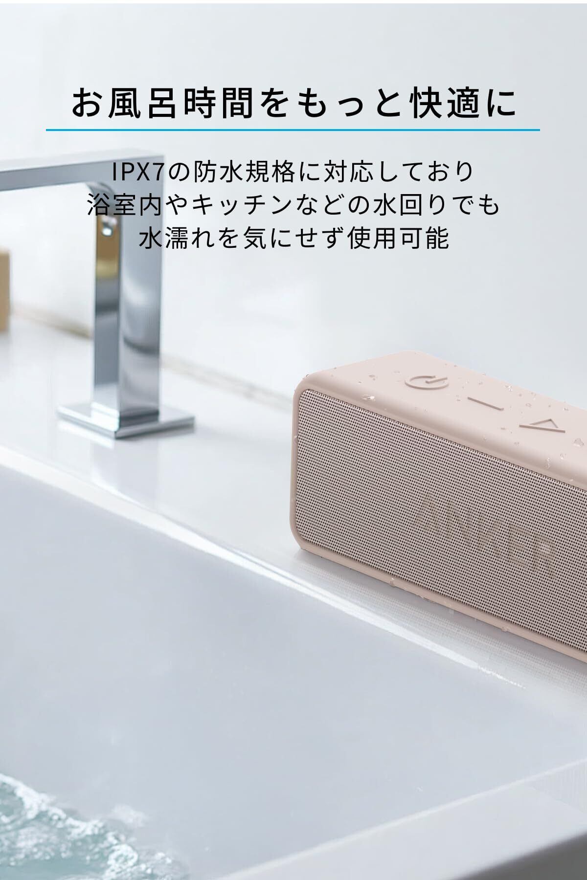 IPX7の防水規格:IPX7の防水規格対応なので、浴室内やキッチンなどの水回りでも水濡れを心配することなく音楽を楽しむことができます。