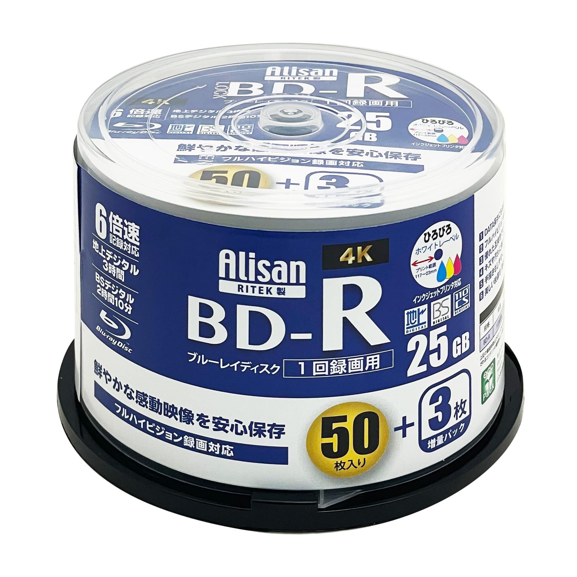 Alisan(アリサン) ブルーレイディスク BD-R 1回録画用 25GB 53枚(50枚+3枚増量) スピンドル 片面1層 1-6倍速 ホワイトレーベル AL-BDR6X53SP