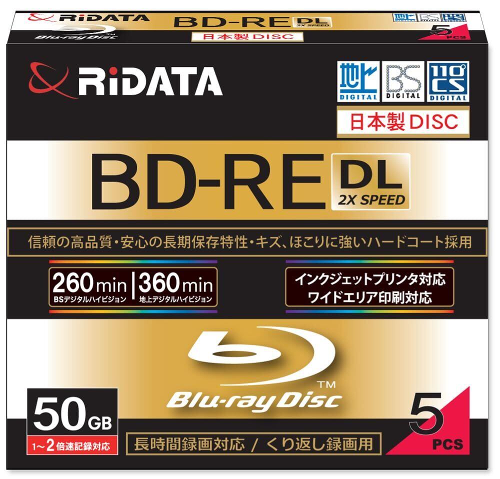 【記録面日本製 MID:MEI-T01-001 Panasonic品質】RiDATA(ライデータ) くり返し録画用 ブルーレイディスク BD-RE DL 50GB 5枚 ホワイトプリンタブル 片面2層 1-2倍速 スリムケース CBE260PW2X.5SC