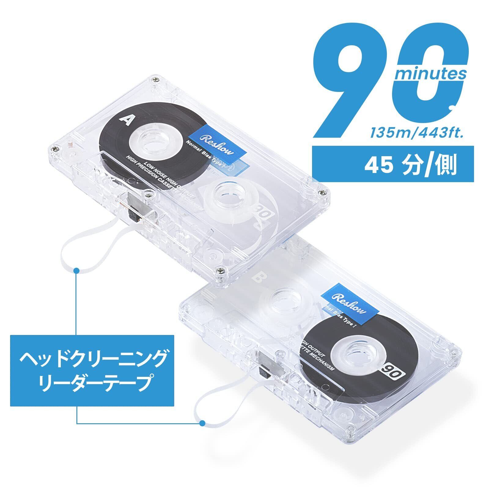 Reshow オーディオカセット低ノイズ高出力90分時間空白カセットテープ個別クリアプラスチックカセットテープケース、毎日の録音に最適 (ブルー - 5個入り)