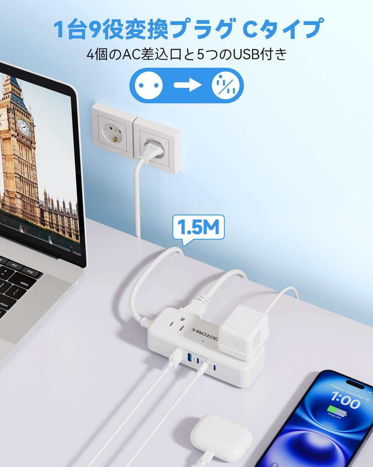 変換プラグ Cタイプ 韓国 コンセント 海外旅行用 変換アダプター 1.5m延長コード付き|AC差込口4個+USBポート5個(USB-C×3)|韓国・イタリア・スペイン・ドイツ・ベトナム・フランス・トルコなどの国に対応
