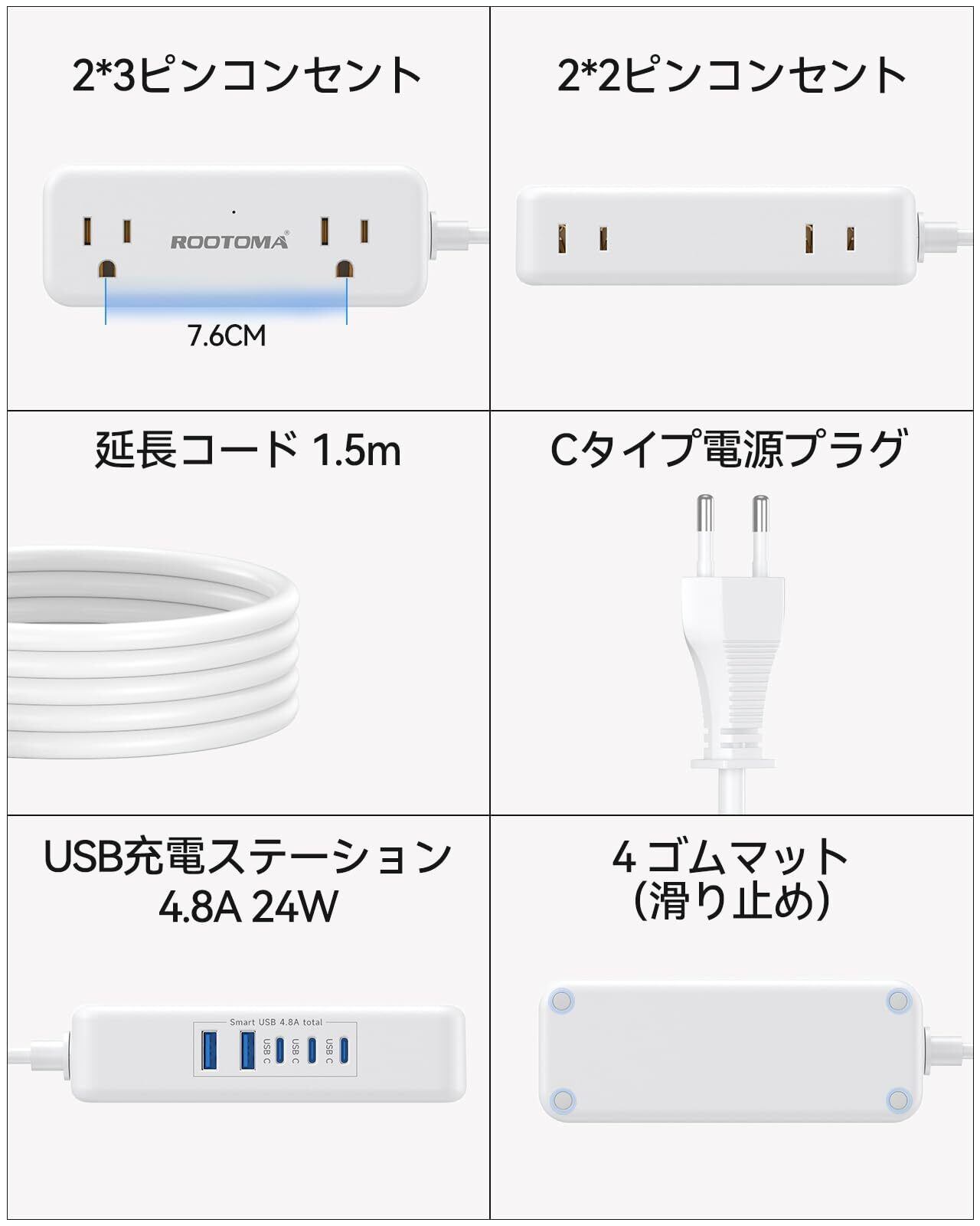 [5ポートUSB充電ステーション] 合計最大24W(5V 4.8A)出力で複数機器を同時充電。スマート充電機能搭載で、接続したデバイスを自動判別し最適な速度で充電します。USBポートが複数あるため、旅行時に追加のUSB充電器を持ち歩く必要がありません