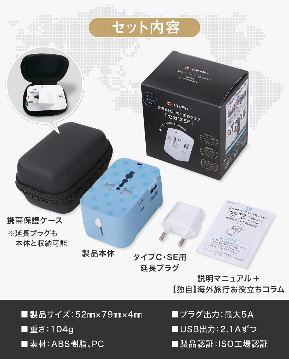 【るるぶ掲載・新色登場】セカプラ 全世界対応×ダブルUSBポート搭載 変換プラグ コンパクト 旅行用 海外用 コンセント ダブル USBポート 韓国 用延長プラグ 専用ケース付き 海外旅行 よくあるトラブル10選と対応策コラム付属 【経産省ツーリストモデル認証済み】ベーシックモデル 海外用 日本国内使用不可 (ドット柄(ライトブルー×ブルー))