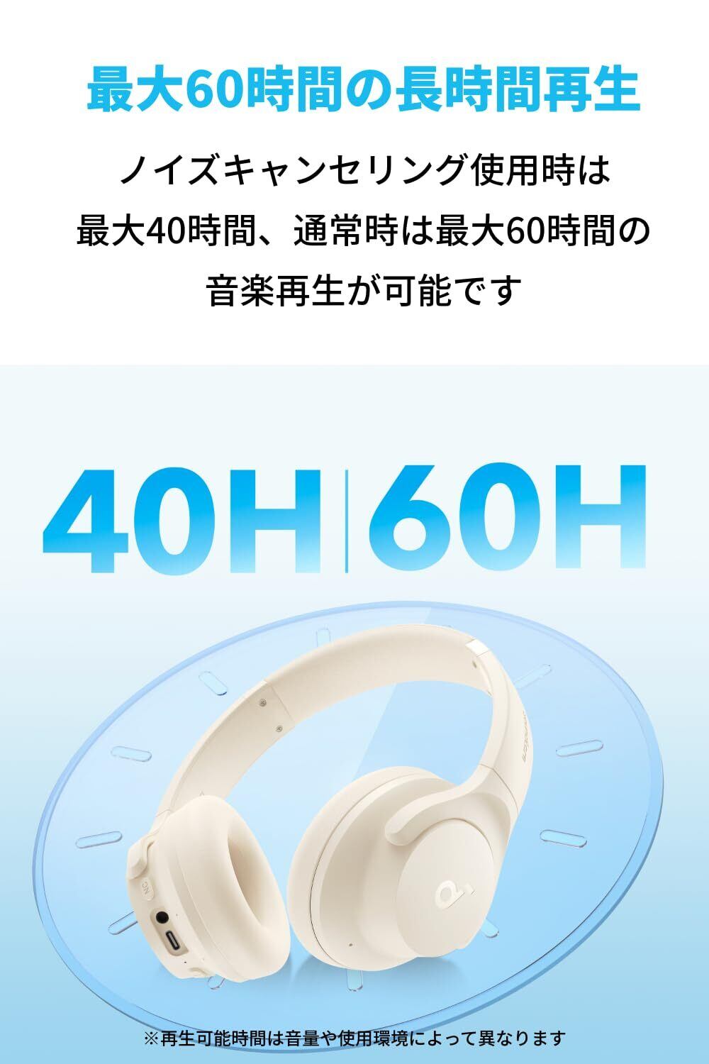 最大60時間の長時間再生:ノイズキャンセリング使用時は最大40時間、通常時は最大60時間の音楽再生が可能。5分間の充電で約4時間の音楽再生も可能です。※再生可能時間は音量や使用環境によって異なります。