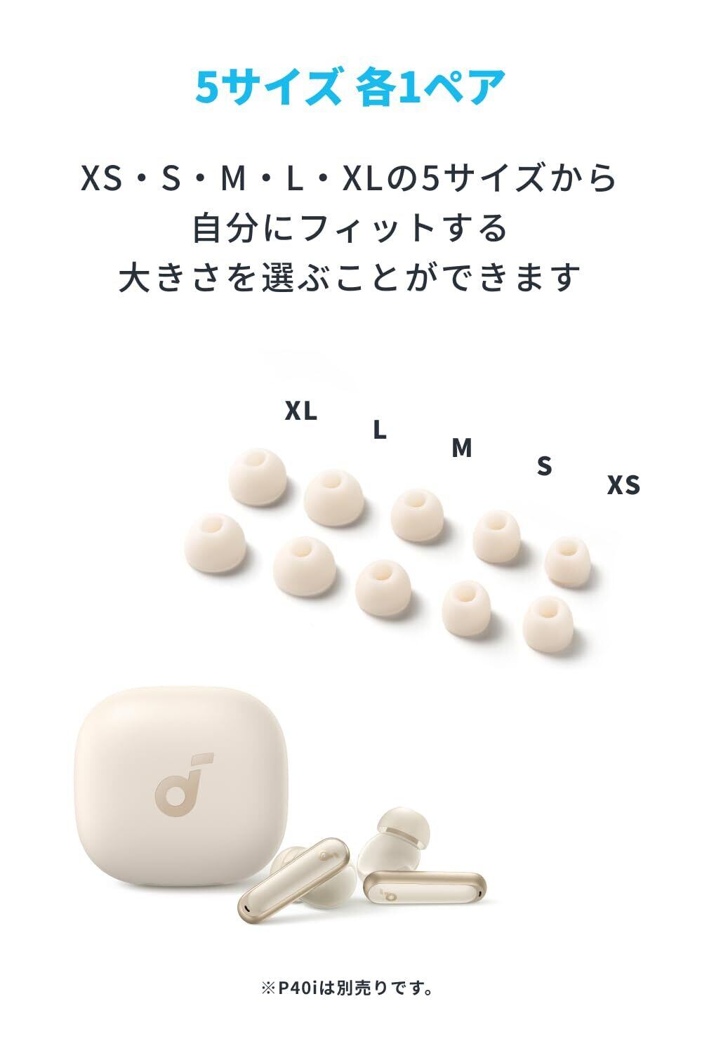 Anker Soundcore P40i専用イヤーピース【完全ワイヤレスイヤホン向けイヤーチップ/シリコン / 5サイズ 各1ペア / 10個入り / XS/S/M/L/XL 】(Soundcore P40i オフホワイト対応)