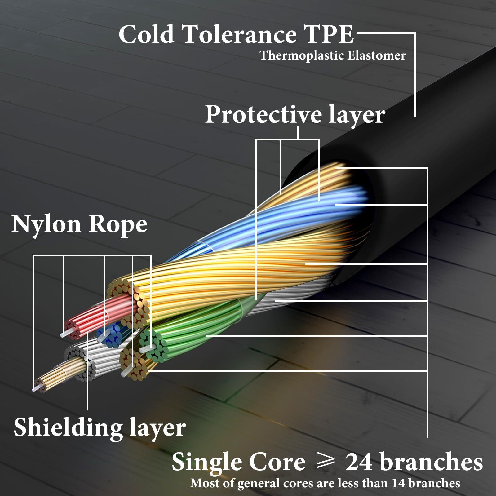 熱可塑性エラストマー(TPE)と頑丈に設計されたポリプロピレンヤーンは、電子磁気または電波干渉(EMI or RFI)に対する優れたオーディオ転送、極度の低温または高温、および最大限の保護をします。