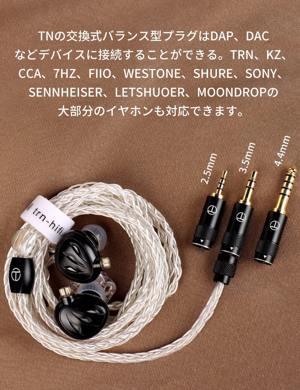 【5】TRN-TNイヤホンアップグレードケーブルはオリジナル製品です。この店はTRNブランドの公式旗艦店です。当店でお買い上げいただいた商品は、90日の(新品と交換)をさせていただきます。 パッケージ内容:ケーブル本体x 1、 2.5mm+ 3.5mm+ 4.4mm 交換式プラグ。TRN、KZ、CCA、7HZ、fiio、westone、shure、sony、sennheiser、letshuoer、moondropの大部分のイヤホンも対応できます。もしお使いのイヤホンが本ケーブルと互換性があるかどうか不明な場合は、お気軽にカスタマーサポートまでお問い合わせください !