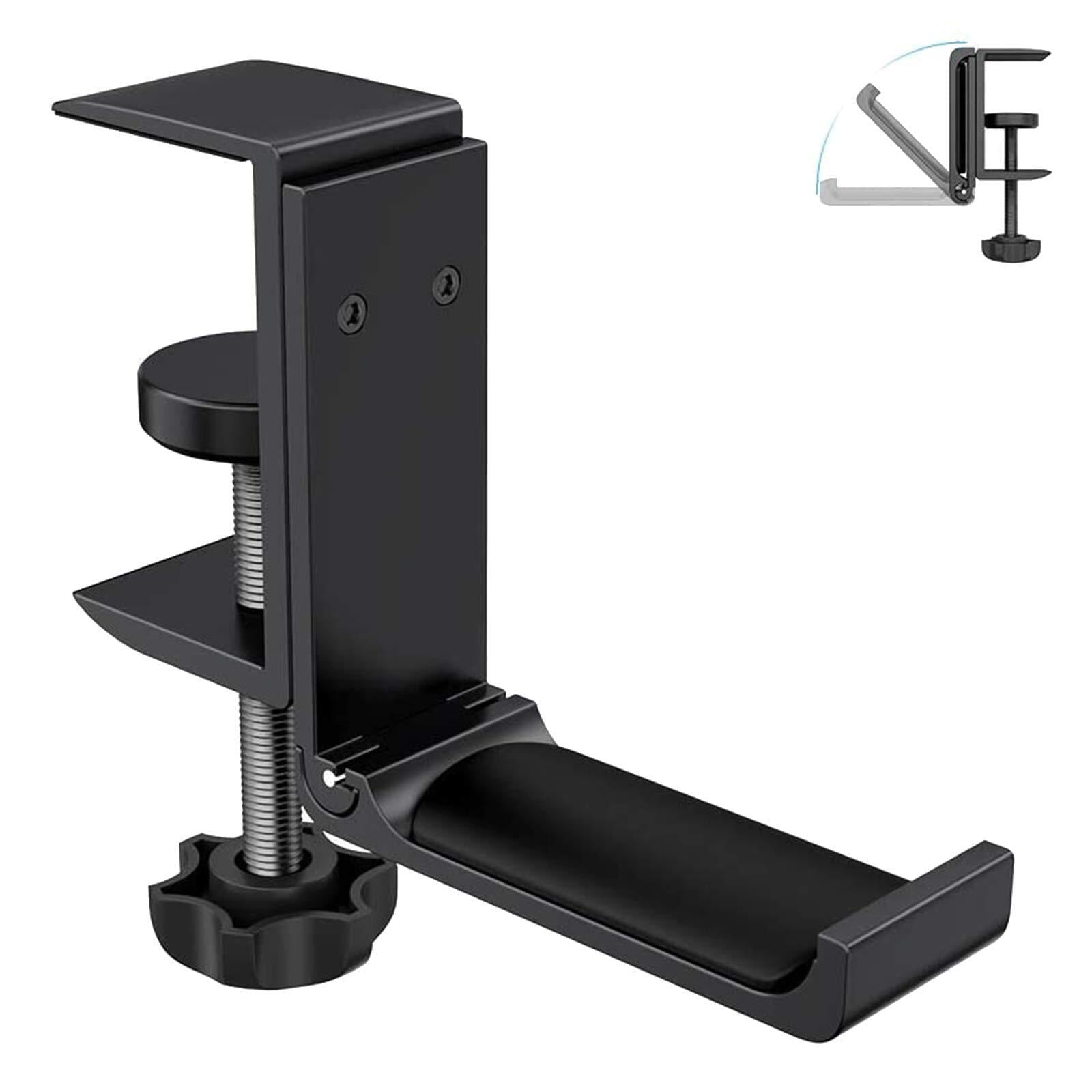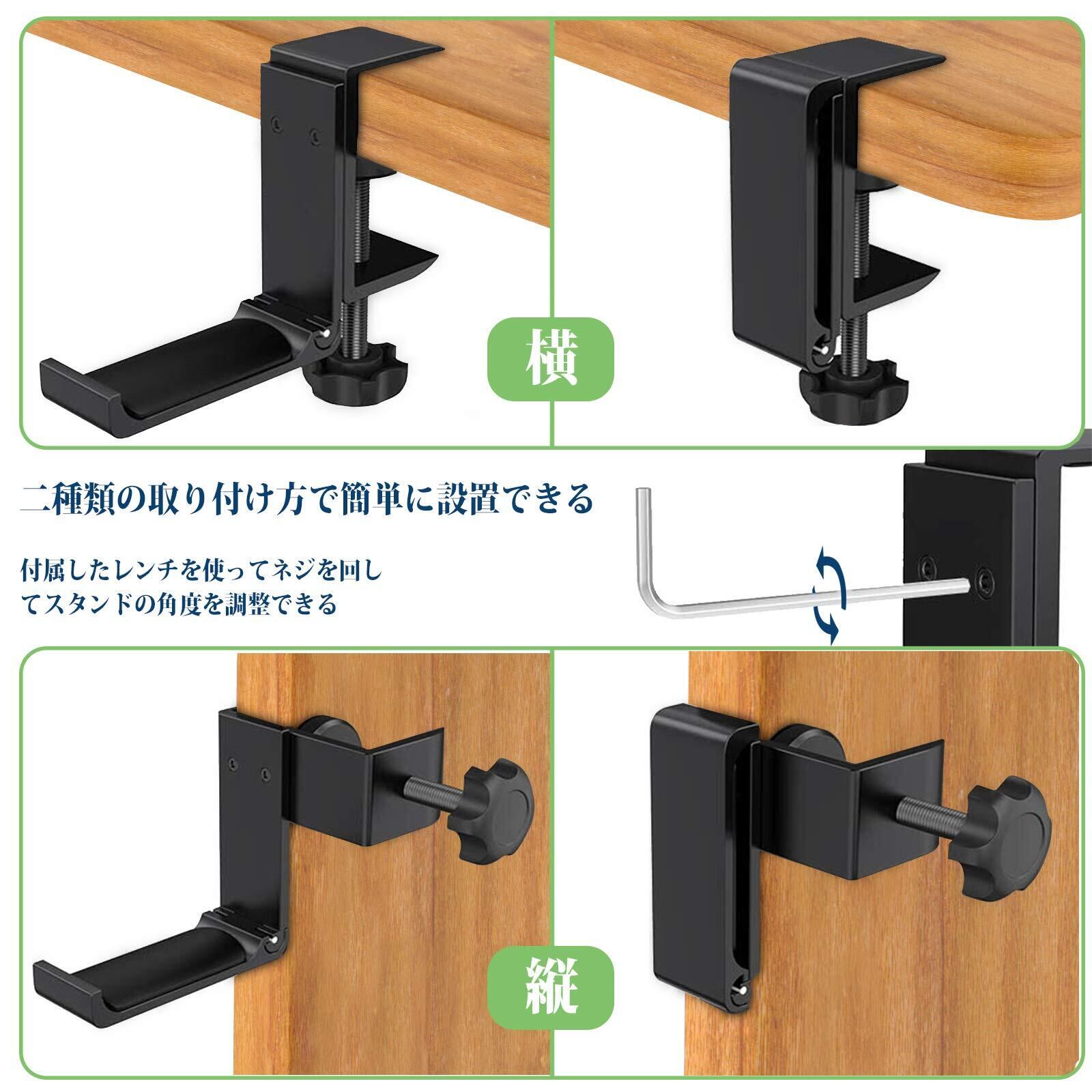 取り付け簡単:調節可能なノブは、簡単に回転させて固定することができ、接着剤は不要で、取り付け、取り外し、または移動が簡単。クランプを机に挟むだけなのですが、きっちり固定できます。スタンド式のホルダーではかけられない高さのあるヘッドホンでも簡単に設置することができます。