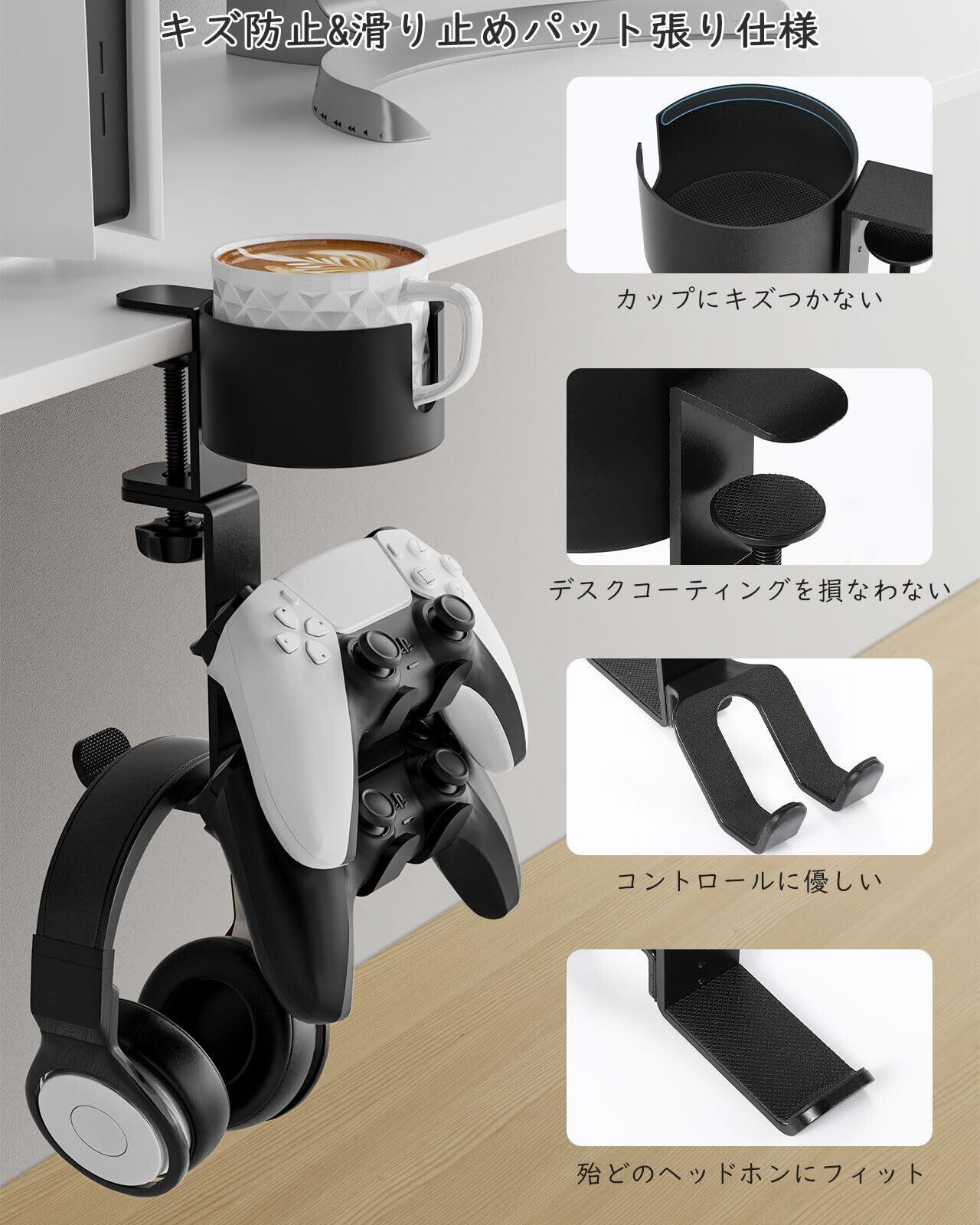 「3in1マルチ収納ホルダー」デスクの天板や棚などに引っ掛けて使用する仕組みになる置きっぱなしにしがちなヘッドホンとコントローラーを同時に収納させるホルダーとなります。デスクのスペースを圧迫せず、場所をとらずにすっきりヘッドホンを掛けておくことができます。基本的なヘッドホンやコントローラー収納用にとどまらず、雑多になりがちなバッグや軽量な傘でも掛けることに対応しております。最大2つのコントローラーと1つのヘッドホンと1つのカップを同時に収納対応できます。