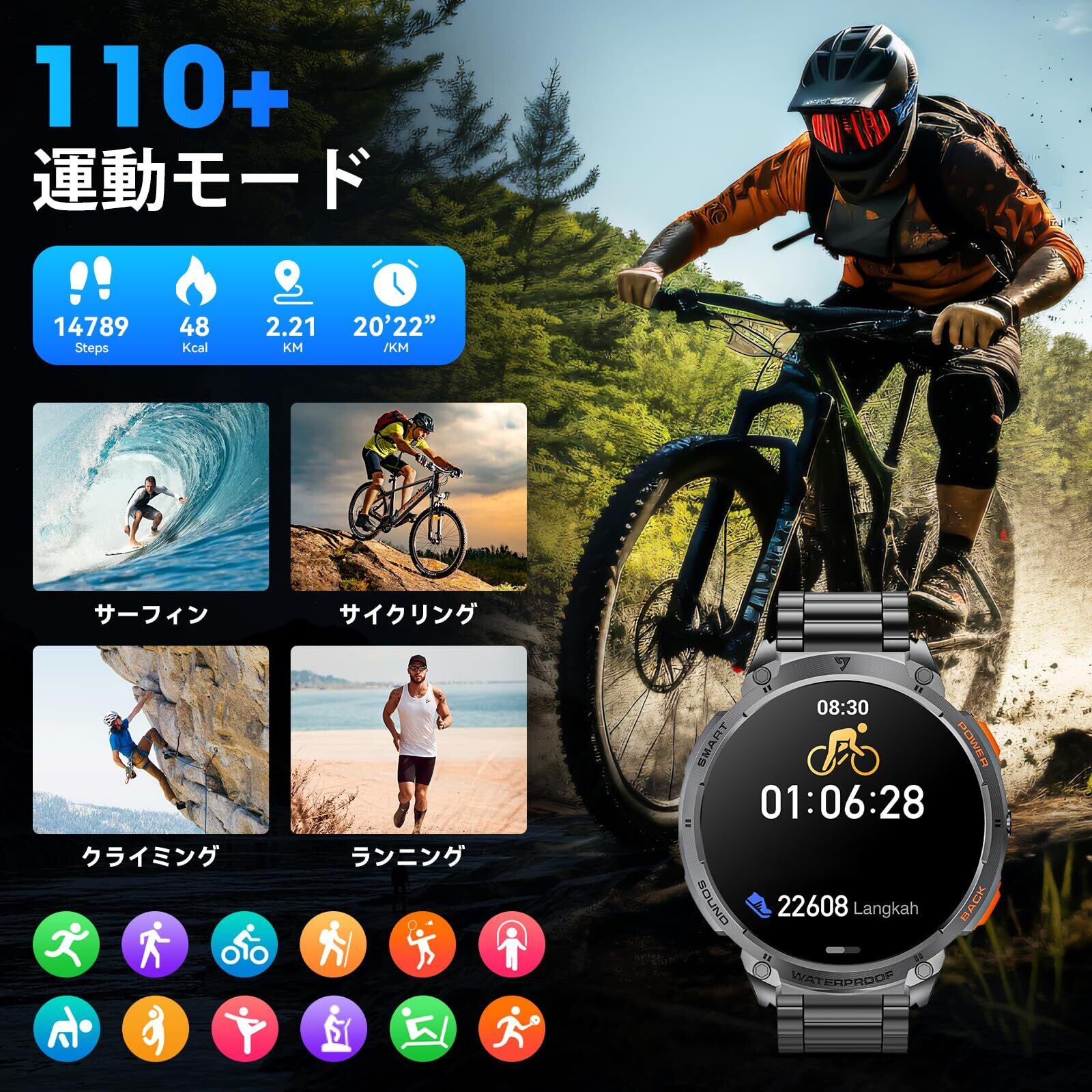 【110+運動モード】このメンズスポーツスマートウォッチは110以上のスポーツモードを提供し、ほぼすべての日常的な身体活動をカバーします。 総運動時間、消費カロリー、歩数、距離を記録し、パフォーマンスを総合的に把握できます。 24時間365日のアクティビティトラッキング機能により、歩数、距離、消費カロリーをモニターし、フィットネス目標に向けた進捗状況を総合的に把握できます。